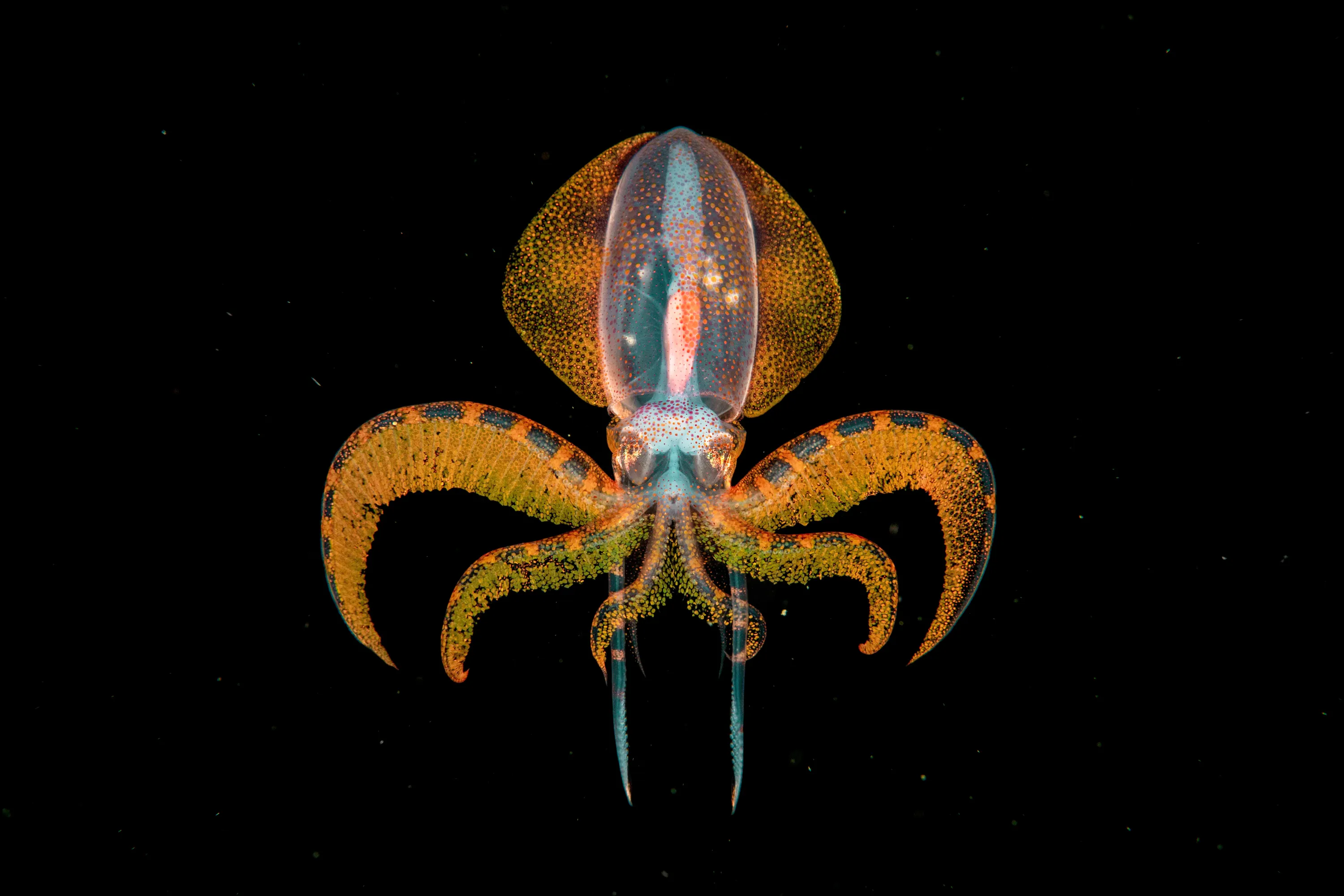 Winner – Under Water: The golden moment by Songda Cai, China. A tiny diamondback squid paralarva flits below in the blackness, stops hunting for an instant when caught in the light beam, gilds itself in shimmering gold and then moves gracefully out of the light. The beam was Songda’s, on a night‑dive over deep water, far off the coast of Anilao, in the Philippines. (Photo by Songda Cai/Wildlife Photographer of the Year 2020)