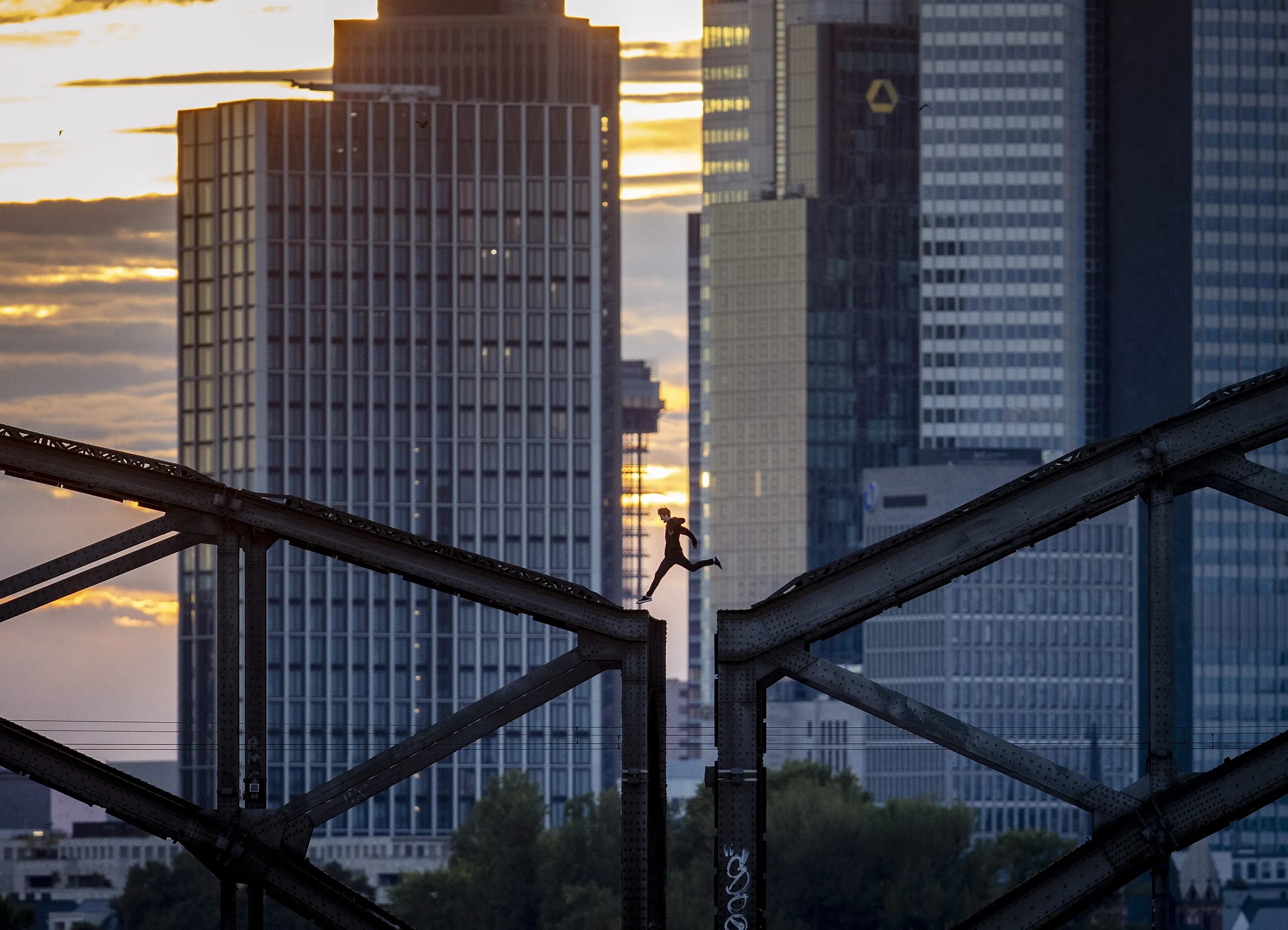 A parkour runner jumps on a railway bridge with the buildings of the banking district in background in Frankfurt, Germany, Wednesday, September 9, 2020. (Photo by Michael Probst/AP Photo)