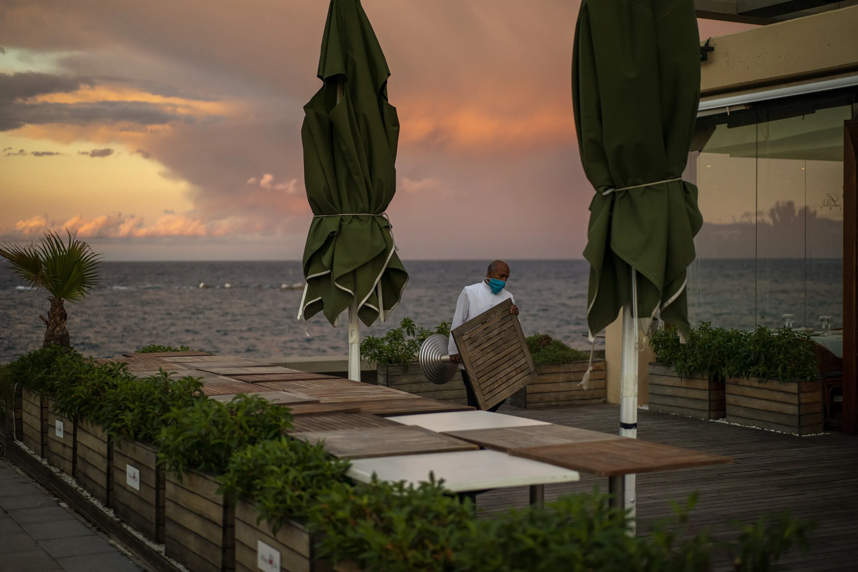 A waiter removes tables outside a restaurant in Barcelona, Spain, Thursday October 15, 2020. Authorities in northeastern Spain ordered shut all bars and restaurants for two weeks as part of fresh restrictions against the spread of the new coronavirus. (Photo by Emilio Morenatti/AP Photo)