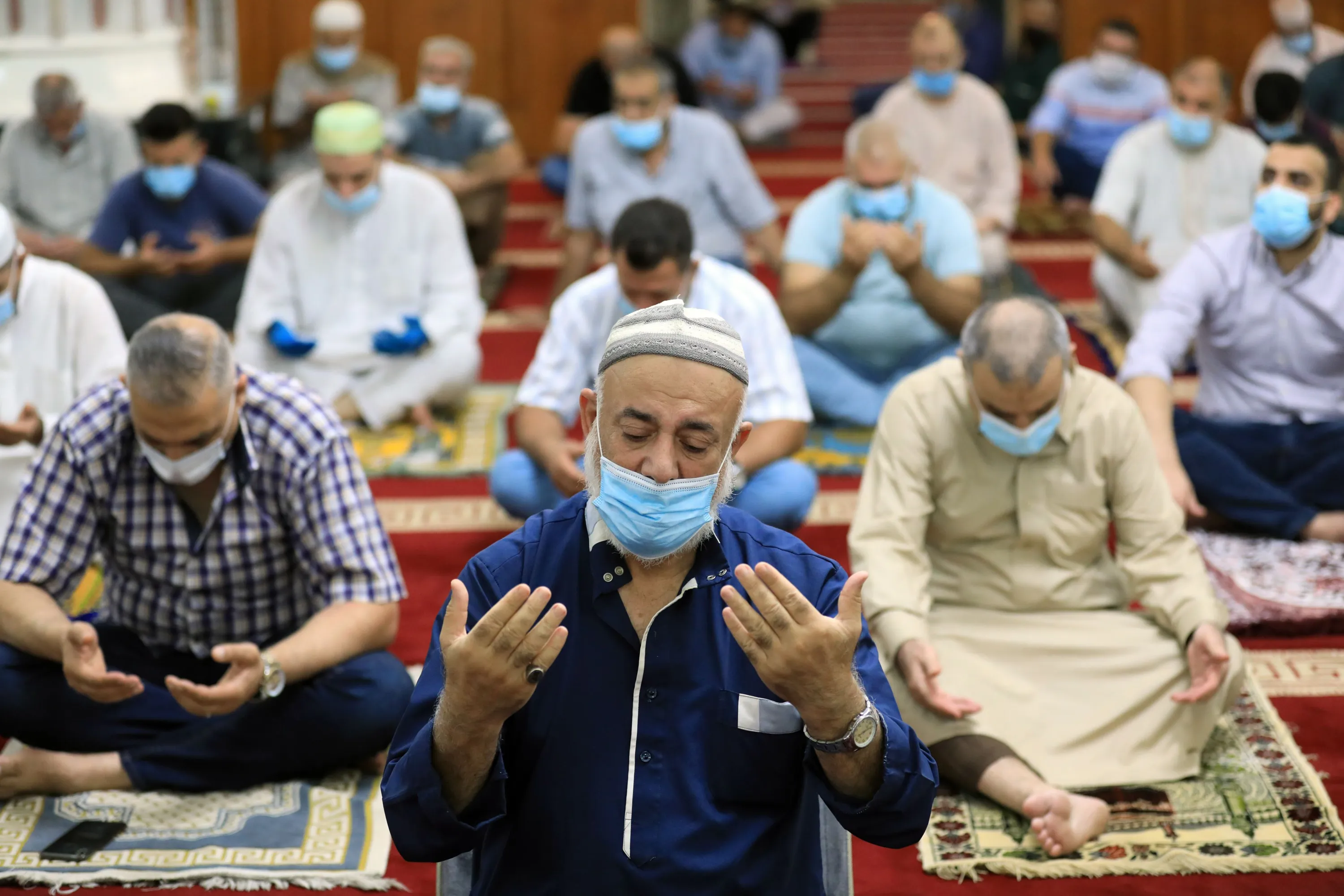 Muslims pray during the first Friday Prayer at Abu Hanifa Mosque after seven months of coronavirus (COVID-19) break in Baghdad, Iraq on October 09, 2020. (Photo by Murtadha Al-Sudani/Anadolu Agency via Getty Images)