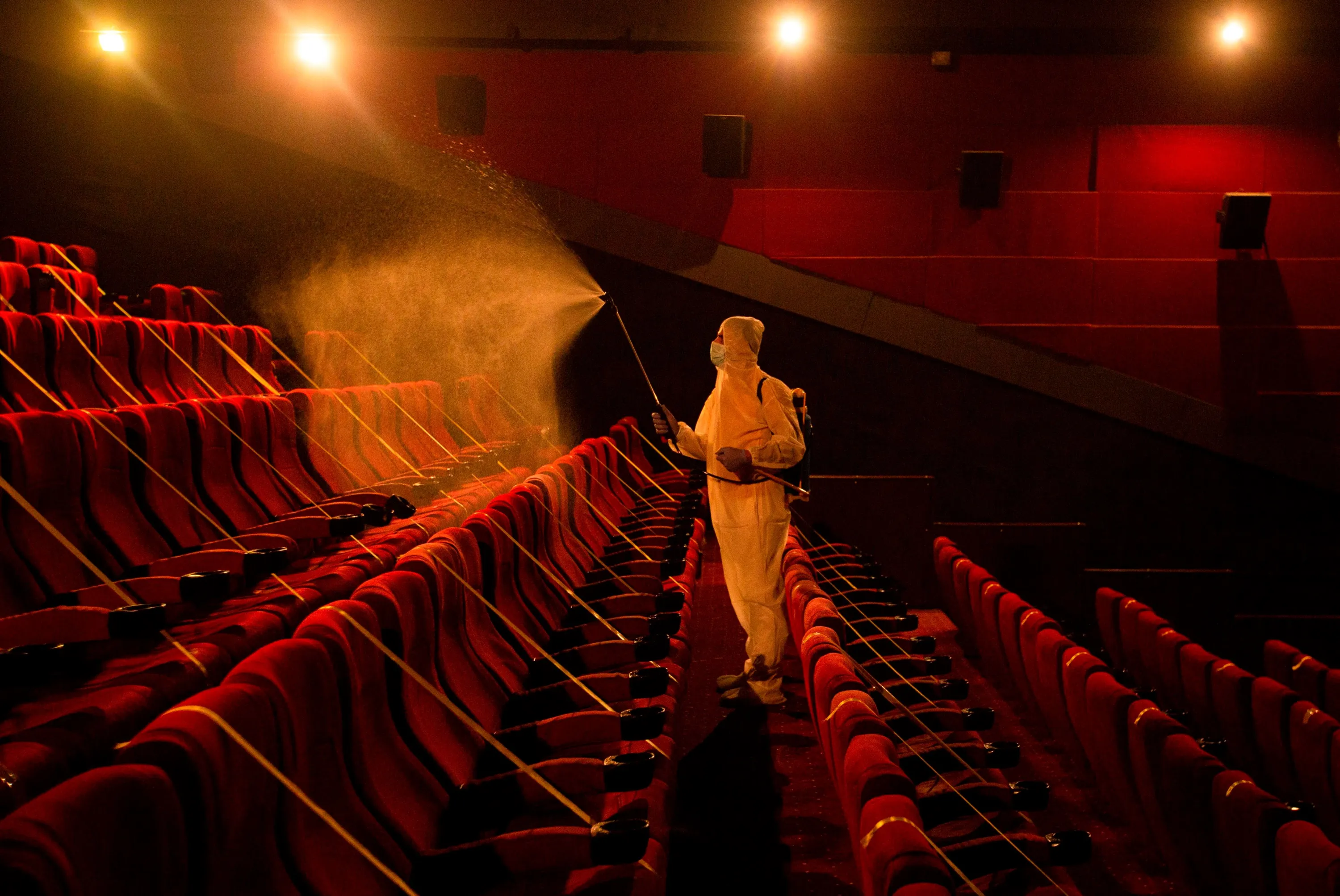 A worker disinfects a movie theatre before its reopening to the public in the southern Iraqi city of Basra on October 14, 2020, following an easing of restrictions imposed by the authorities in a bid to stem the spread of the novel coronavirus. (Photo by Hussein Faleh/AFP Photo)