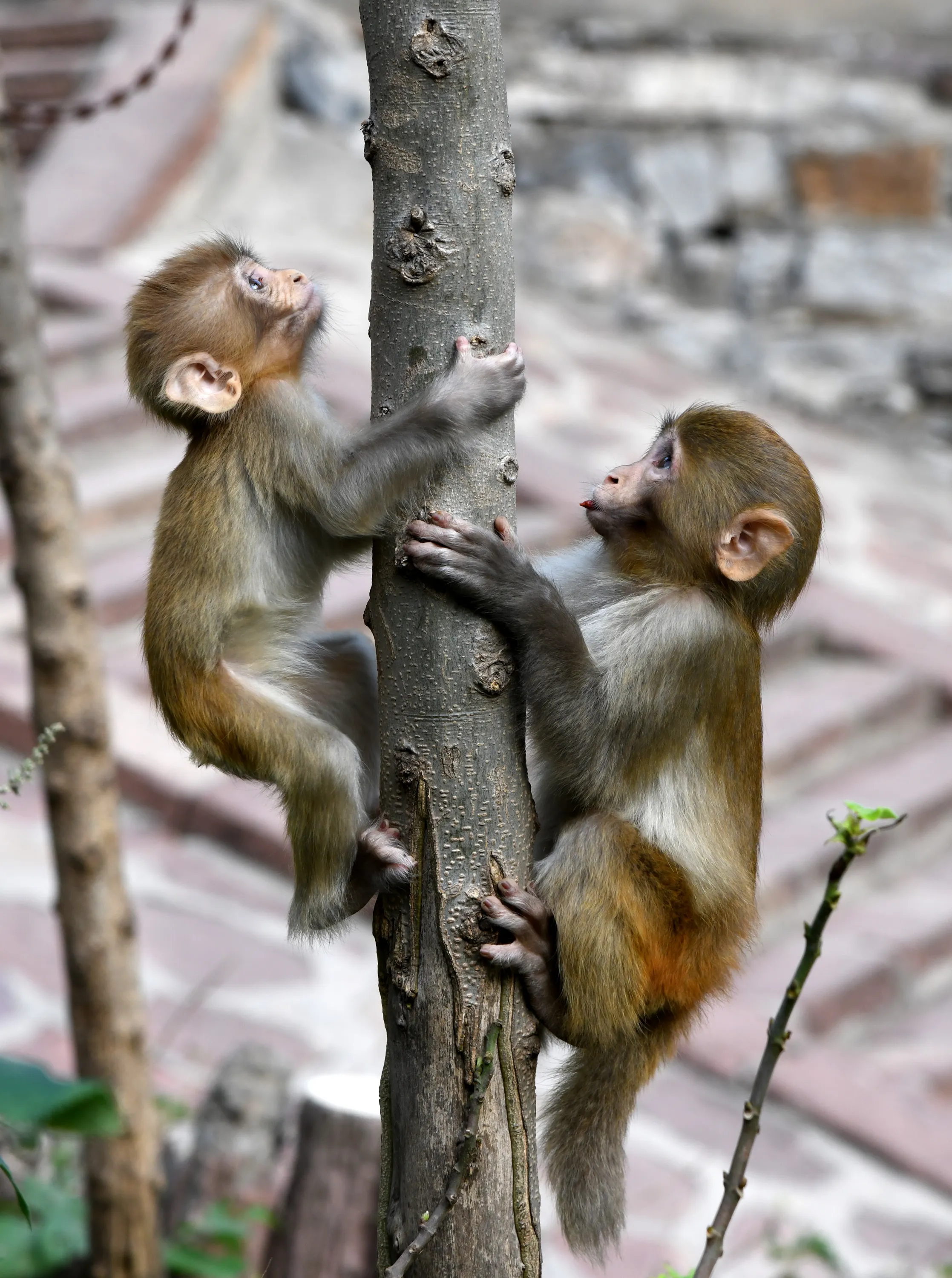 Two wild Taihang macaques learn to climb trees. Jiyuan City, Henan Province, China, October 4, 2020. (Photo by Costfoto/Barcroft Media via Getty Images)
