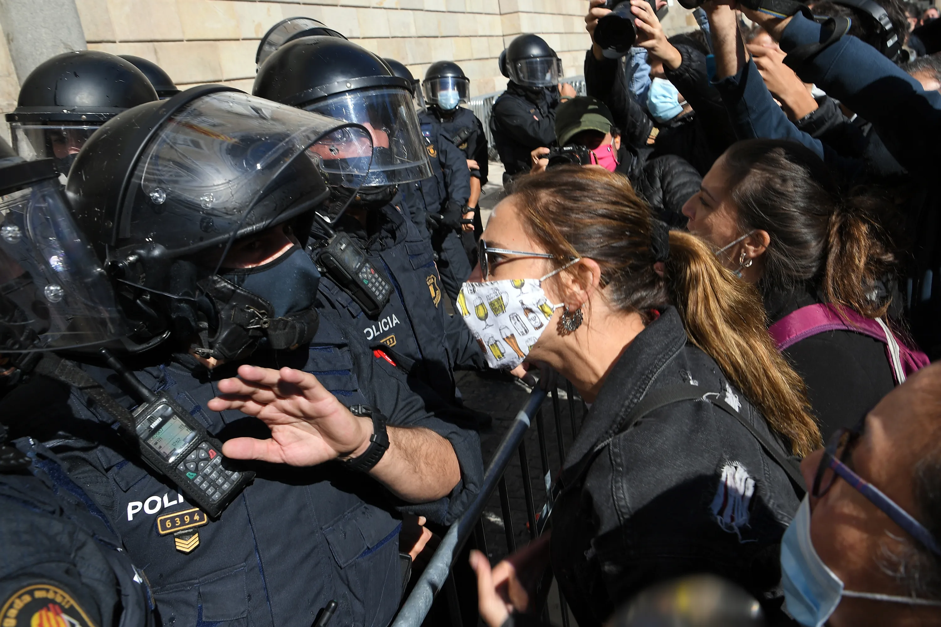Demonstrators protest in front of Catalan regional police during a demonstration on October 16, 2020 in Barcelona to protest against the new restrictions imposed by the regional government on bars and restaurants to fight against COVID-19 disease. Bars and restaurants are to be closed across Spain's northeastern Catalonia region for the next 15 days to slow rising coronavirus infections, the regional government said on October 14, 2020. The move comes as Spain battles one of the highest rates of infection in the European Union, with nearly 900,000 infections and more than 33,000 deaths. (Photo by Lluis Gene/AFP Photo)
