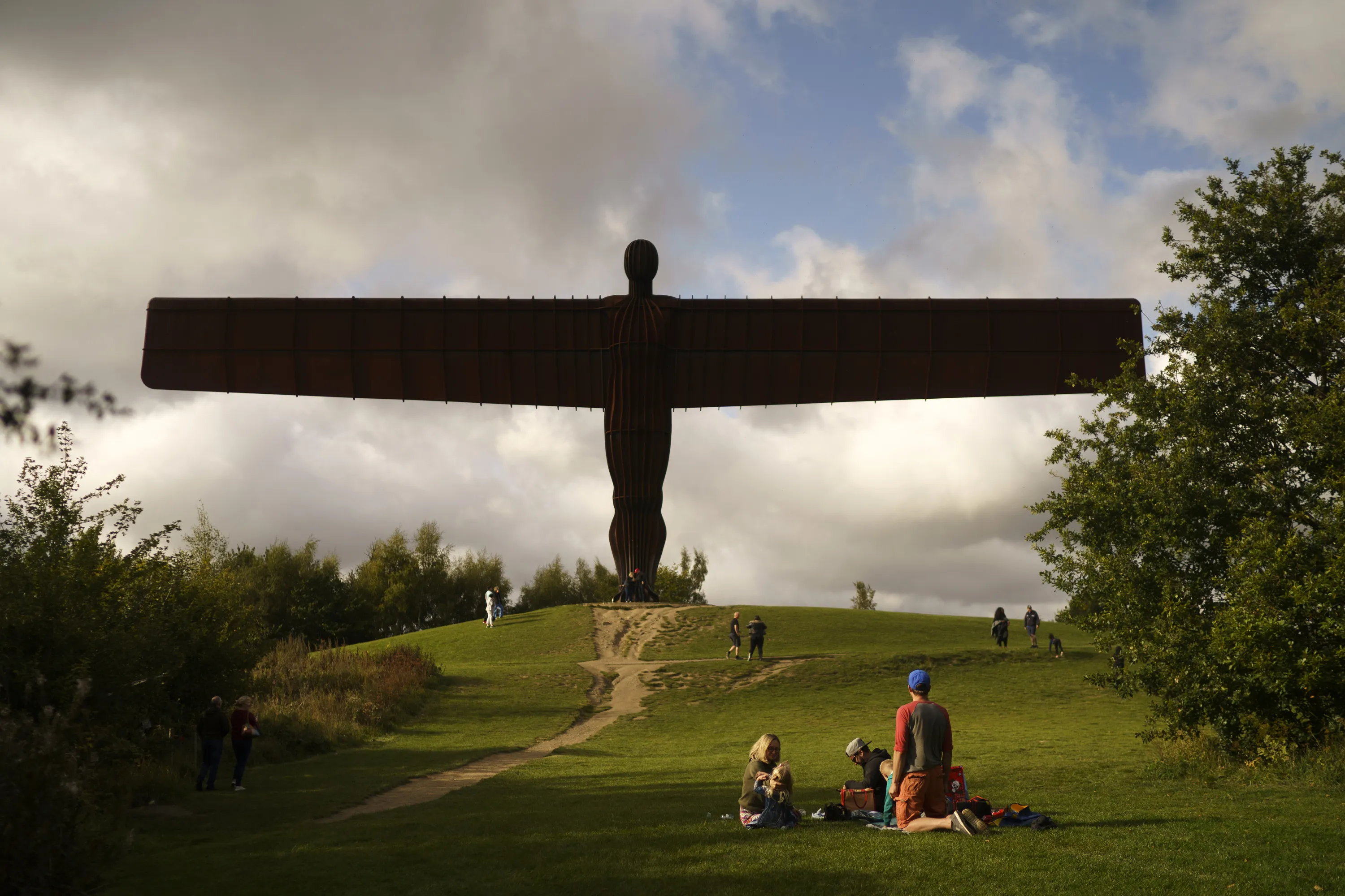 A family enjoy a picnic next to the Angel of the North on September 19, 2020 in Gateshead, United Kingdom. Since easing its first nationwide lockdown in May, England has imposed localised lockdown rules on towns across the Midlands and North, in what the prime minister termed a "whac-a-mole" approach to battling Covid-19 flare-ups. Last weekend, almost two million people in Newcastle and surrounding areas were banned from meeting other households, and pubs and restaurants were told to close by 10pm. As the UK government implements similar rules across England, a tour through the towns with local lockdowns shows how Britons are coping with the government's lurching response to the pandemic. (Photo by Christopher Furlong/Getty Images)