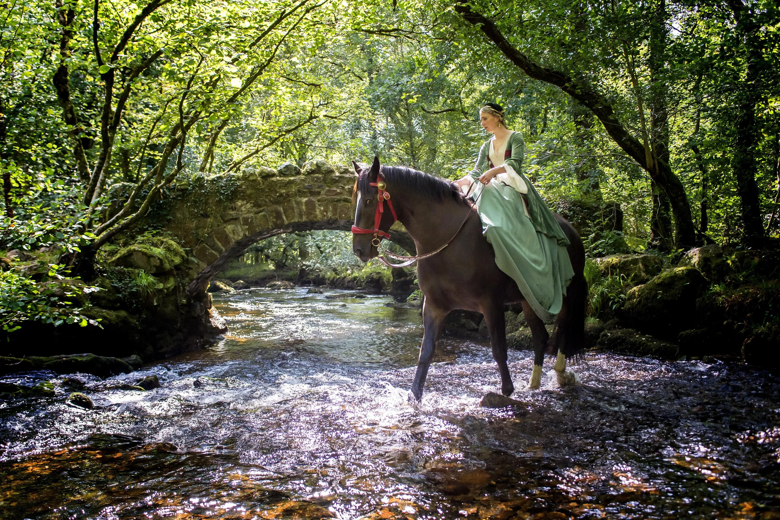Sarah Kate Byrne, a stylist, wore a side saddle gown from the Royal Opera House for this fashion portrait at the River Bovey in Hisley Wood on Dartmoor, UK in September 2020. (Photo by Hazel Mansell Greenwood/The Times)