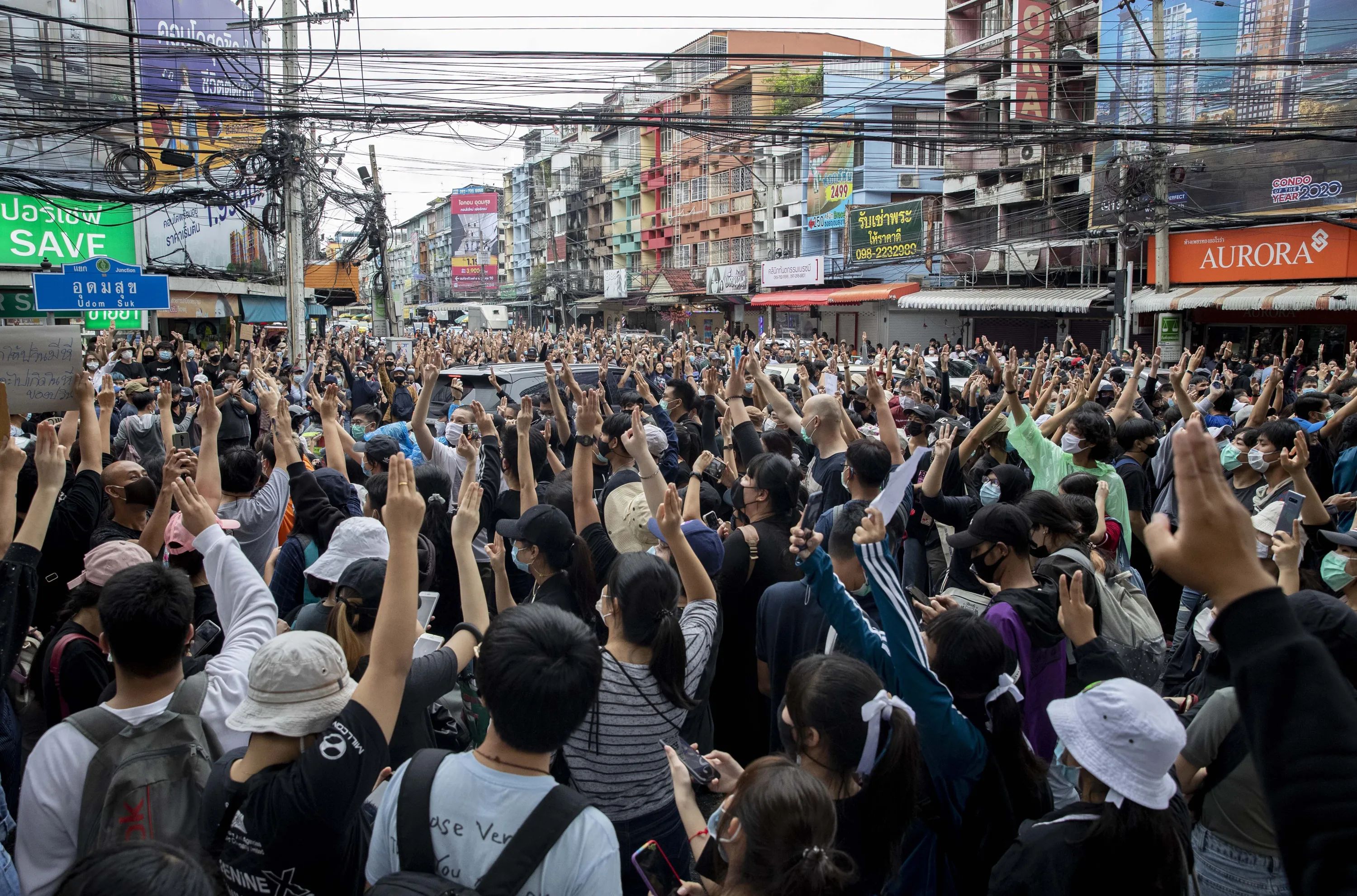 Pro-democracy protesters flash three-fingered salute during a protest in Udom Suk, suburbs of Bangkok, Thailand, Saturday, October 17, 2020. The authorities in Bangkok shut down mass transit systems and set up roadblocks Saturday as Thailand’s capital faced a fourth straight day of determined anti-government protests. (Photo by Gemunu Amarasinghe/AP Photo)