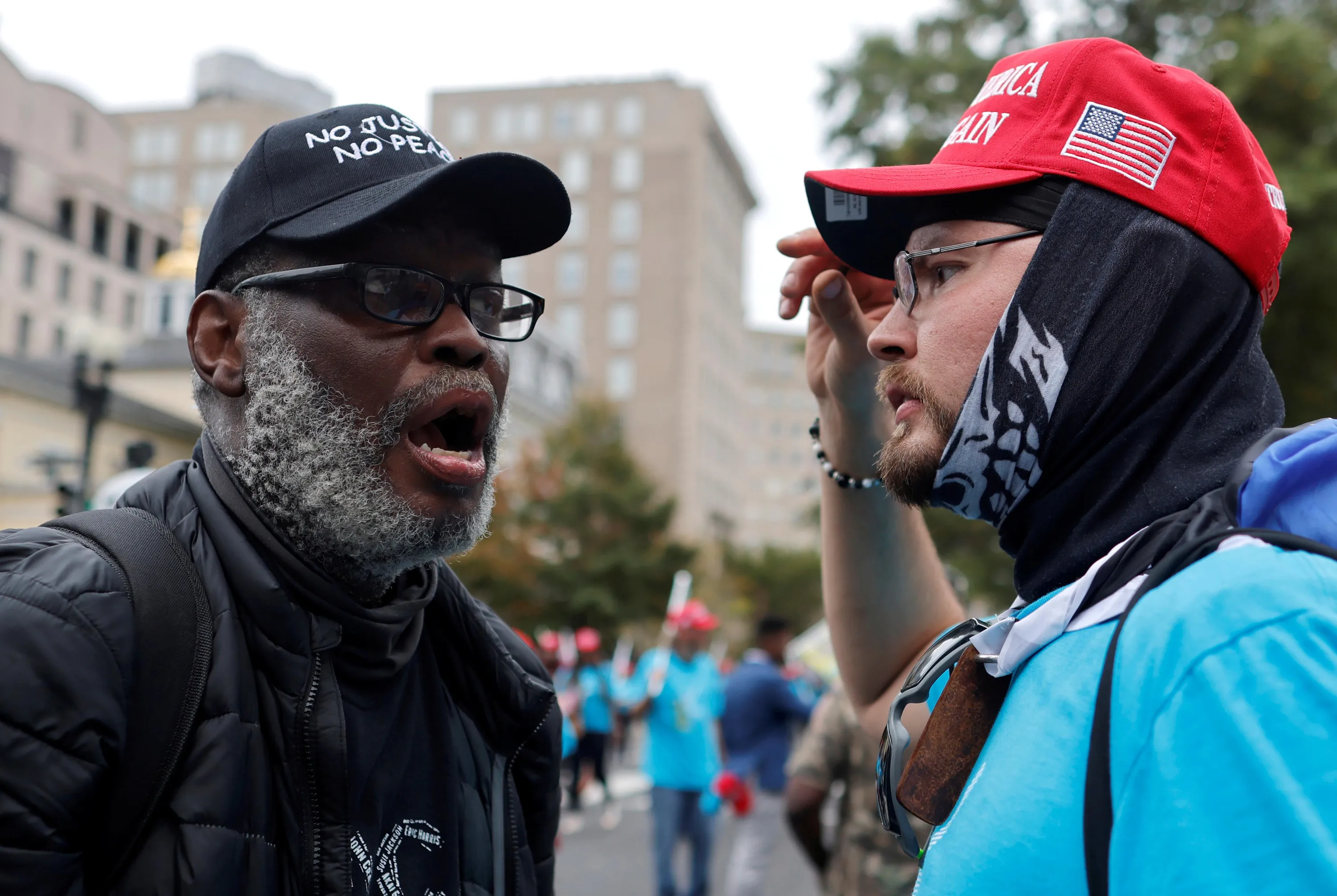 A man and a supporter of U.S. President Donald Trump exchange words during a march around the perimeter of the White House after the President's campaign rally on the South Lawn in Washington, U.S., October 10, 2020. (Photo by Carlos Barria/Reuters)