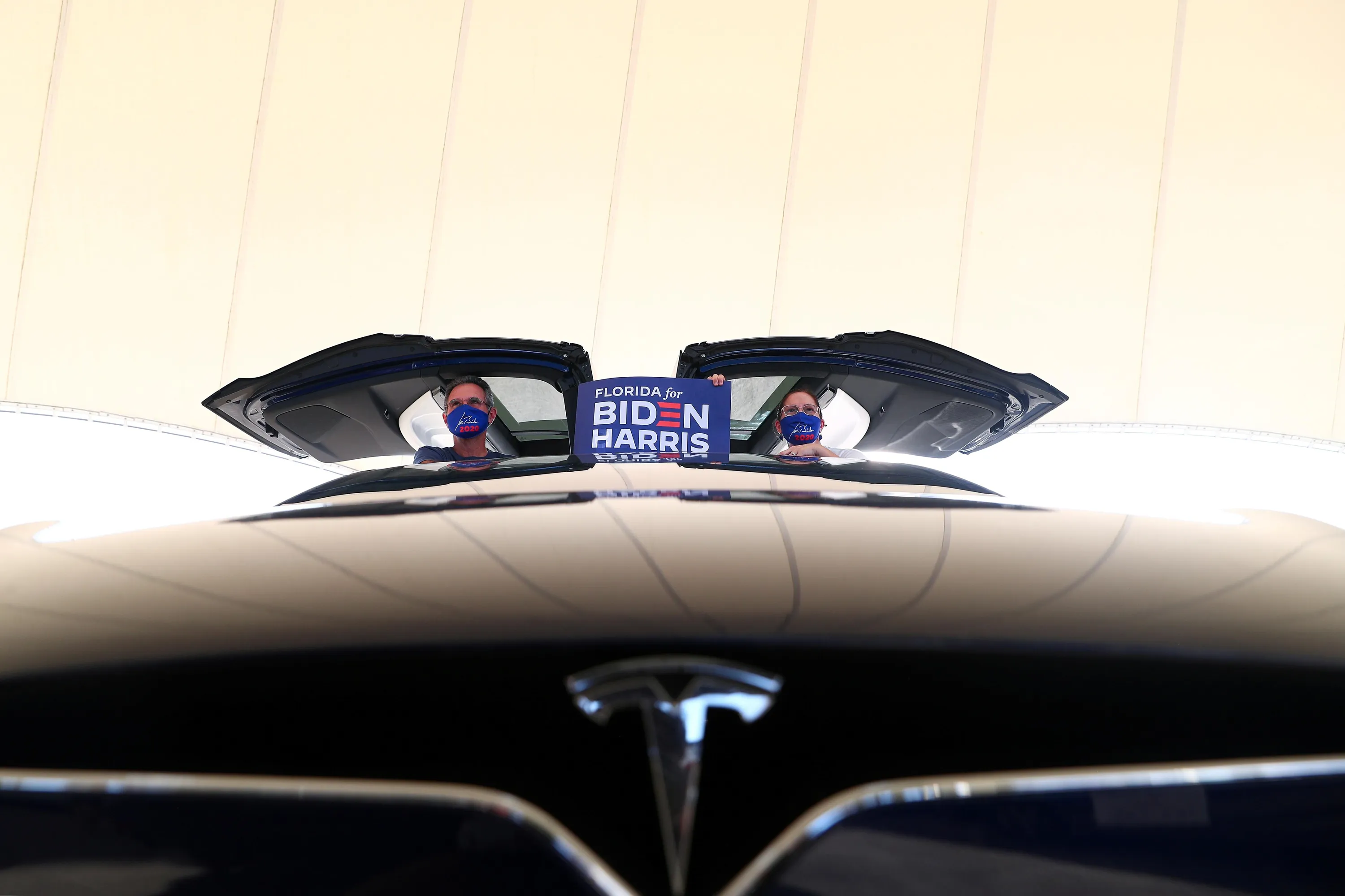 Supporters watch from their vehicles as U.S. Democratic presidential candidate Joe Biden delivers remarks during a voter mobilization event, at Miramar Regional Park in Miramar, Florida, U.S., October 13, 2020. (Photo by Tom Brenner/Reuters)
