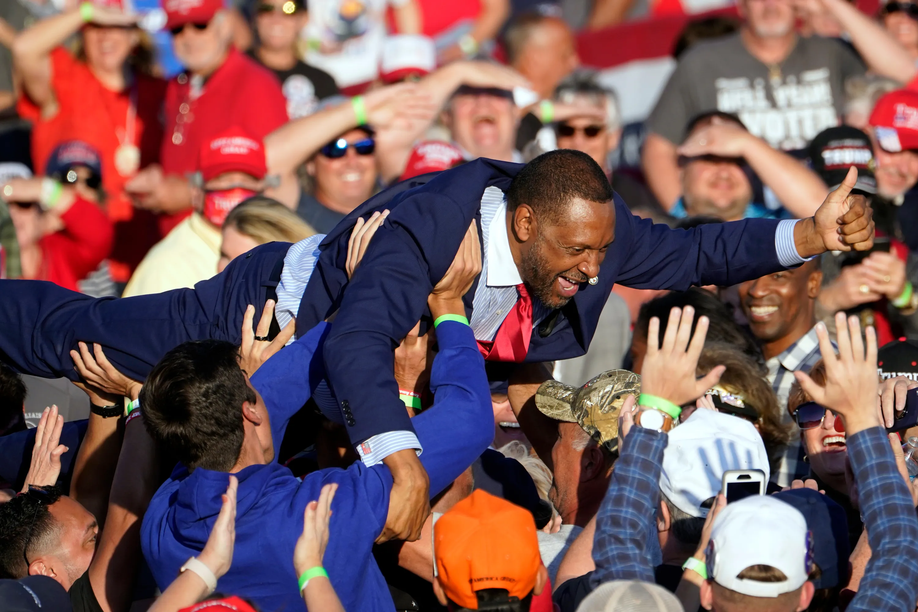 Georgia state Rep. Vernon Jones crowd surfs during a campaign rally for President Donald Trump at Middle Georgia Regional Airport, Friday, October 16, 2020, in Macon, Ga. (Photo by John Bazemore/AP Photo)