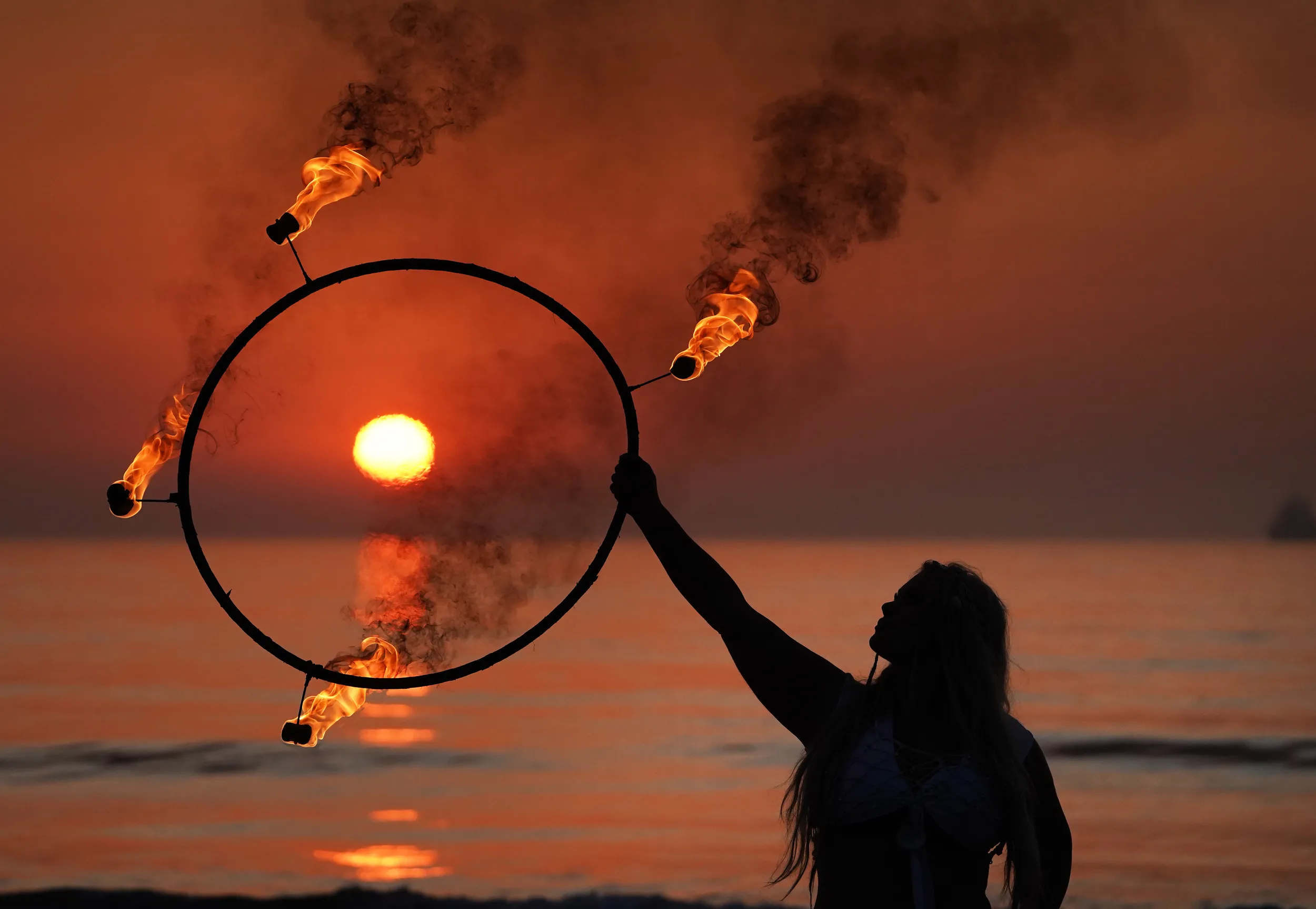 Fire and Light Choreographer Penella Bee from Bee-Enchanted practices her routine on Seaburn beach in Sunderland, England early morning on September 15, 2020. (Photo by Owen Humphreys/PA Images via Getty Images)
