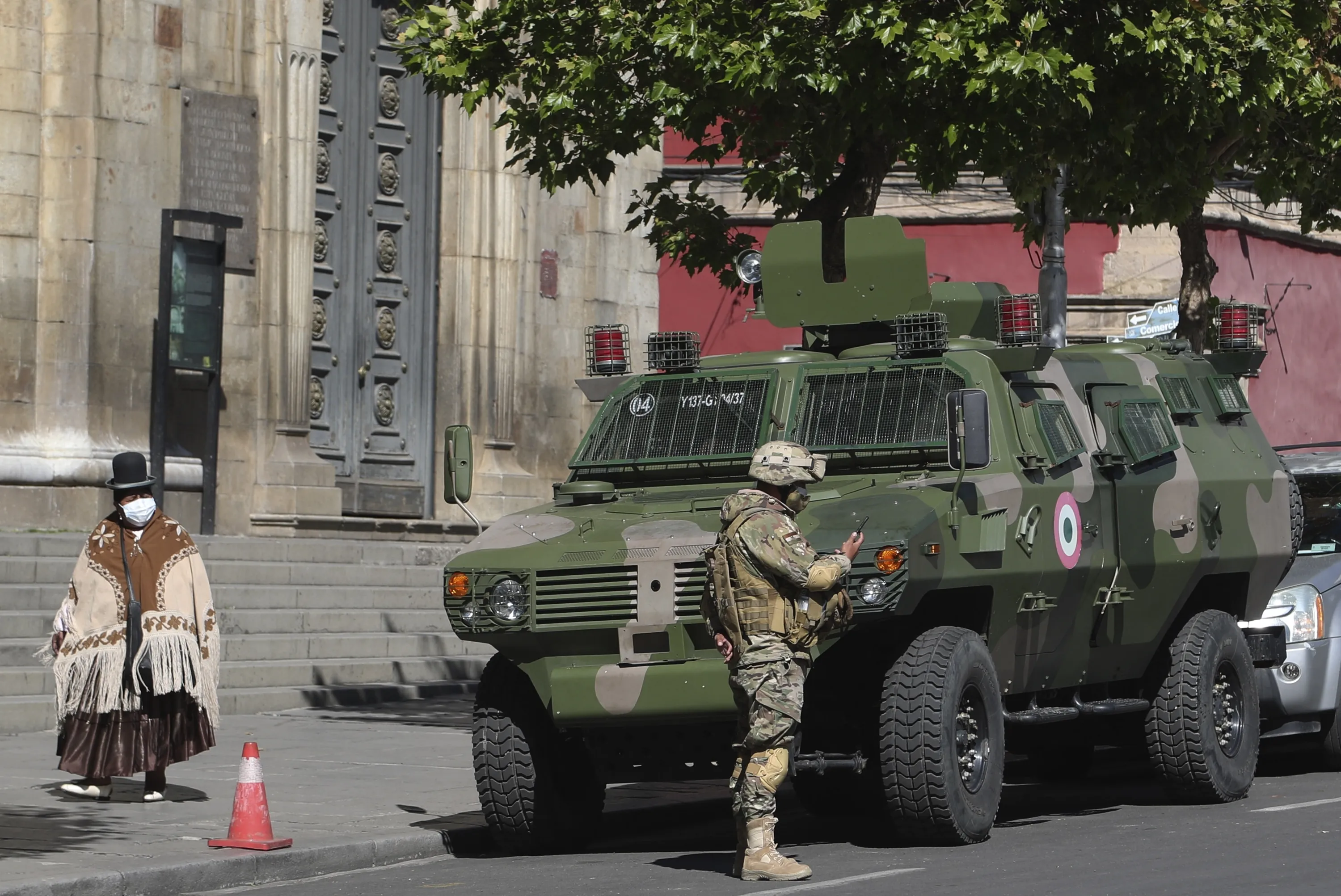 Soldiers stand guard in Plaza Murillo where the Cathedral and government offices are located in La Paz, Bolivia, Monday, October 19, 2020, the morning after general elections. Results trickled in from Bolivia’s presidential election, a high-stakes redo of last year’s annulled ballot that saw president Evo Morales resign and flee the country. (Photo by Martin Mejia/AP Photo)