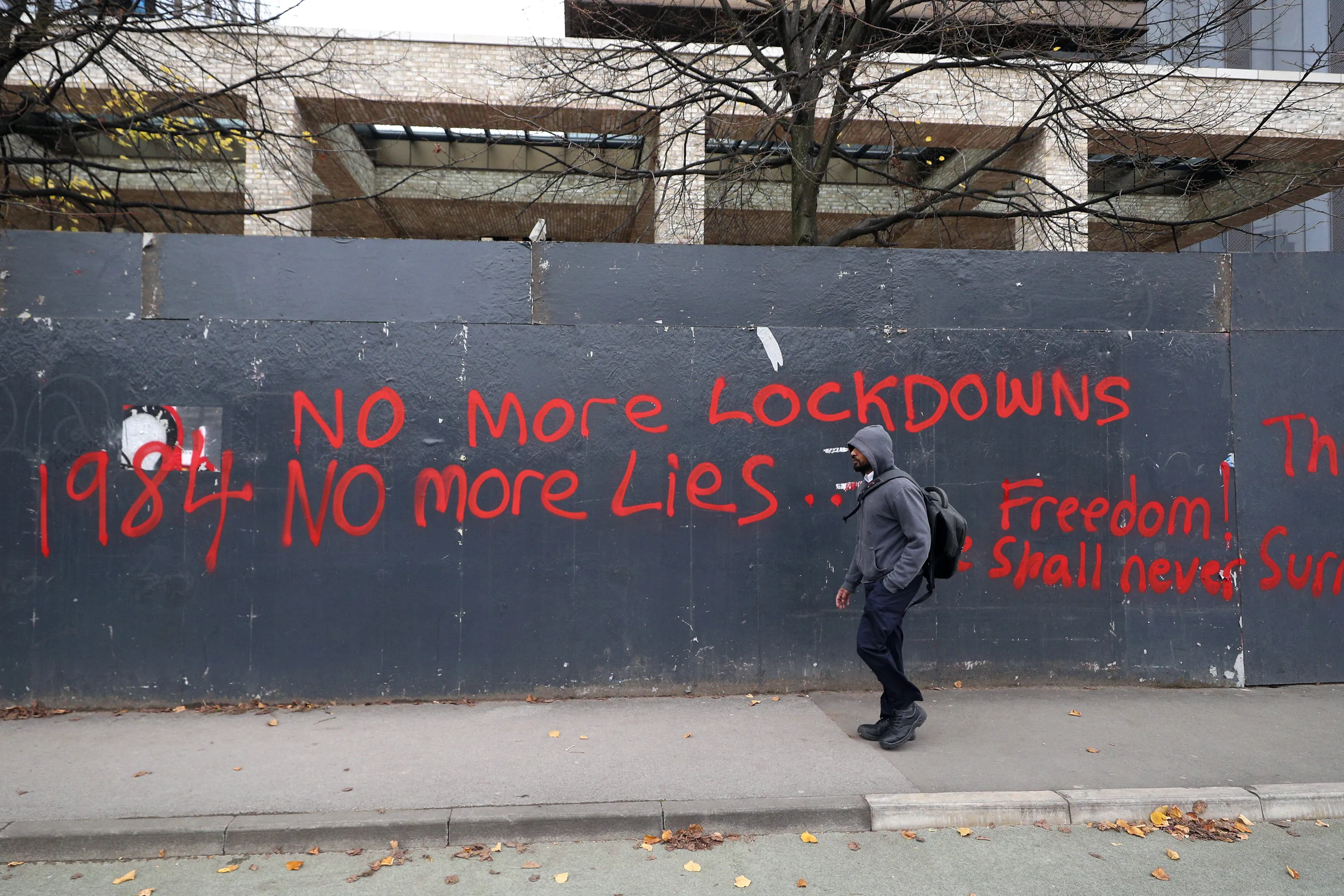 A man walks past anti-lockdown graffiti in Manchester, England, Monday, October 19, 2020 as the row over Greater Manchester region's coronavirus status continues. Britain’s government says discussions about implementing stricter restrictions in Greater Manchester must be completed Monday because the public health threat caused by rising COVID-19 infections is serious and getting worse. (Photo by Peter Byrne/PA Wire via AP Photo)