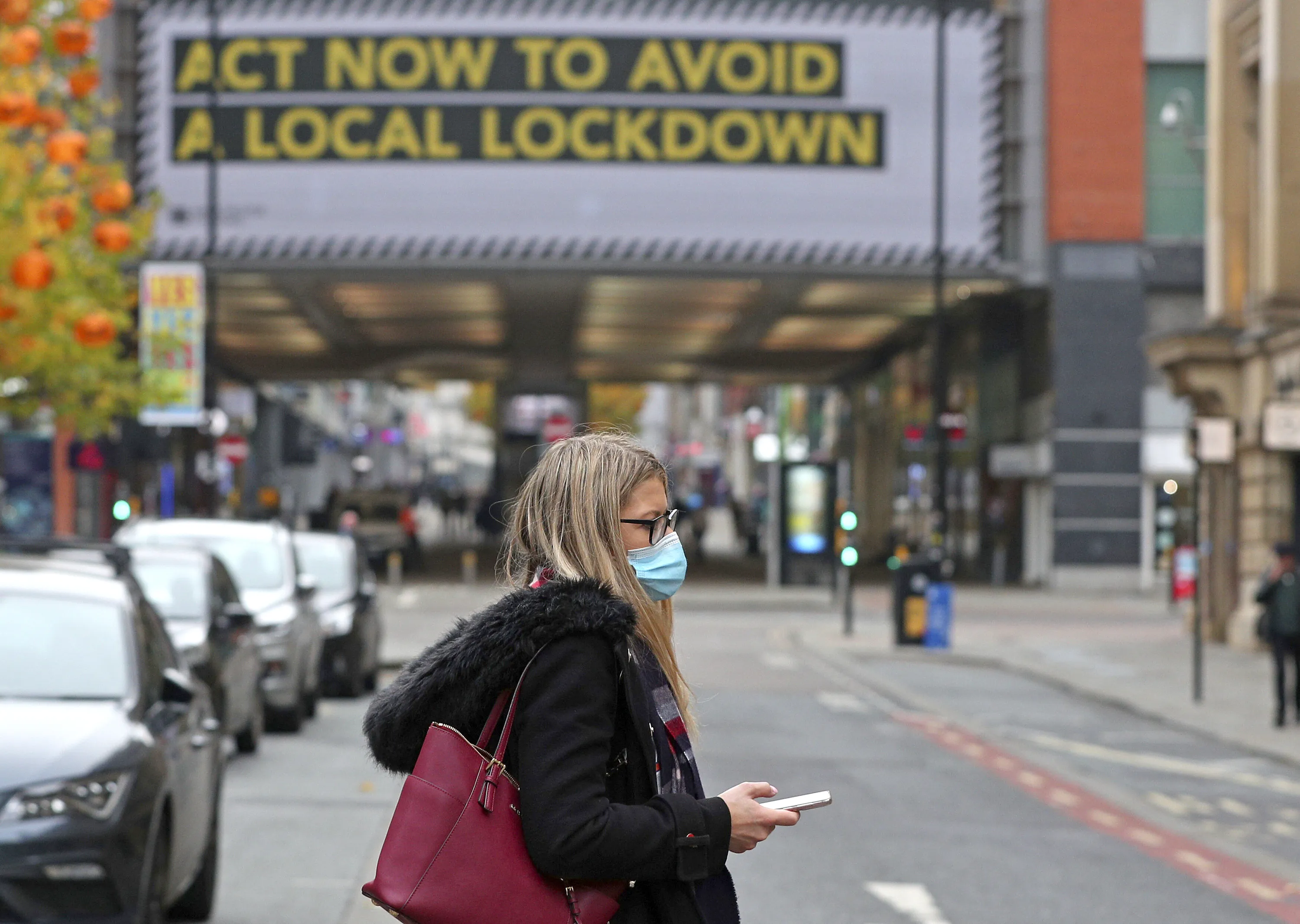A woman wearing a face mask walks in Manchester, England, Monday, October 19, 2020. Britain’s government says discussions about implementing stricter restrictions in Greater Manchester must be completed Monday because the public health threat caused by rising COVID-19 infections is serious and getting worse. (Photo by Peter Byrne/PA Wire via AP Photo)