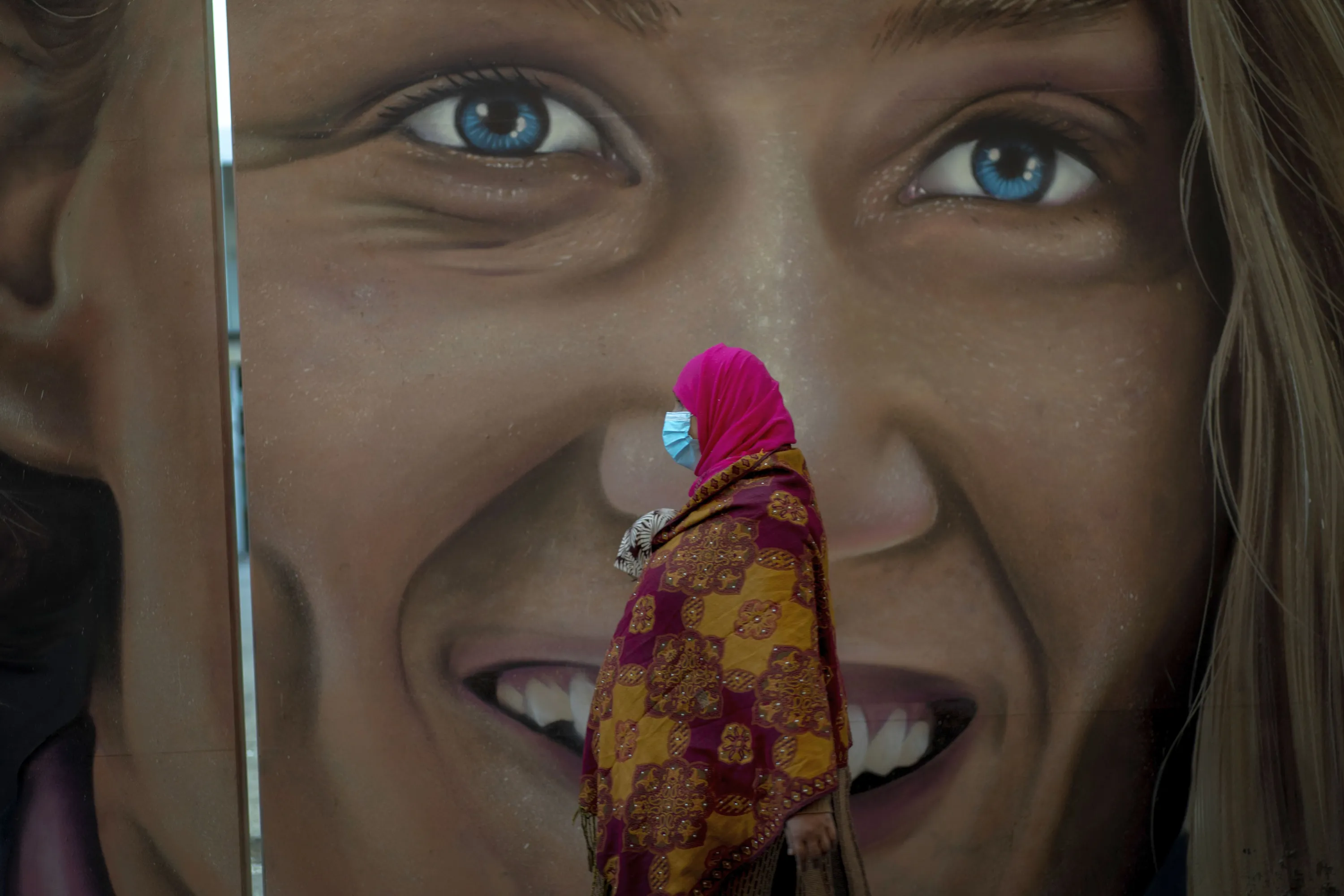 A woman wearing a mask to prevent the spread of the coronavirus walks past a graffiti in Barcelona, Spain, Monday, October 19, 2020. Several Spanish regions adopt new restrictions to deal with the health emergency. Spain is nearing one million infections since the onset of the pandemic, the most in Europe. (Photo by Emilio Morenatti/AP Photo)