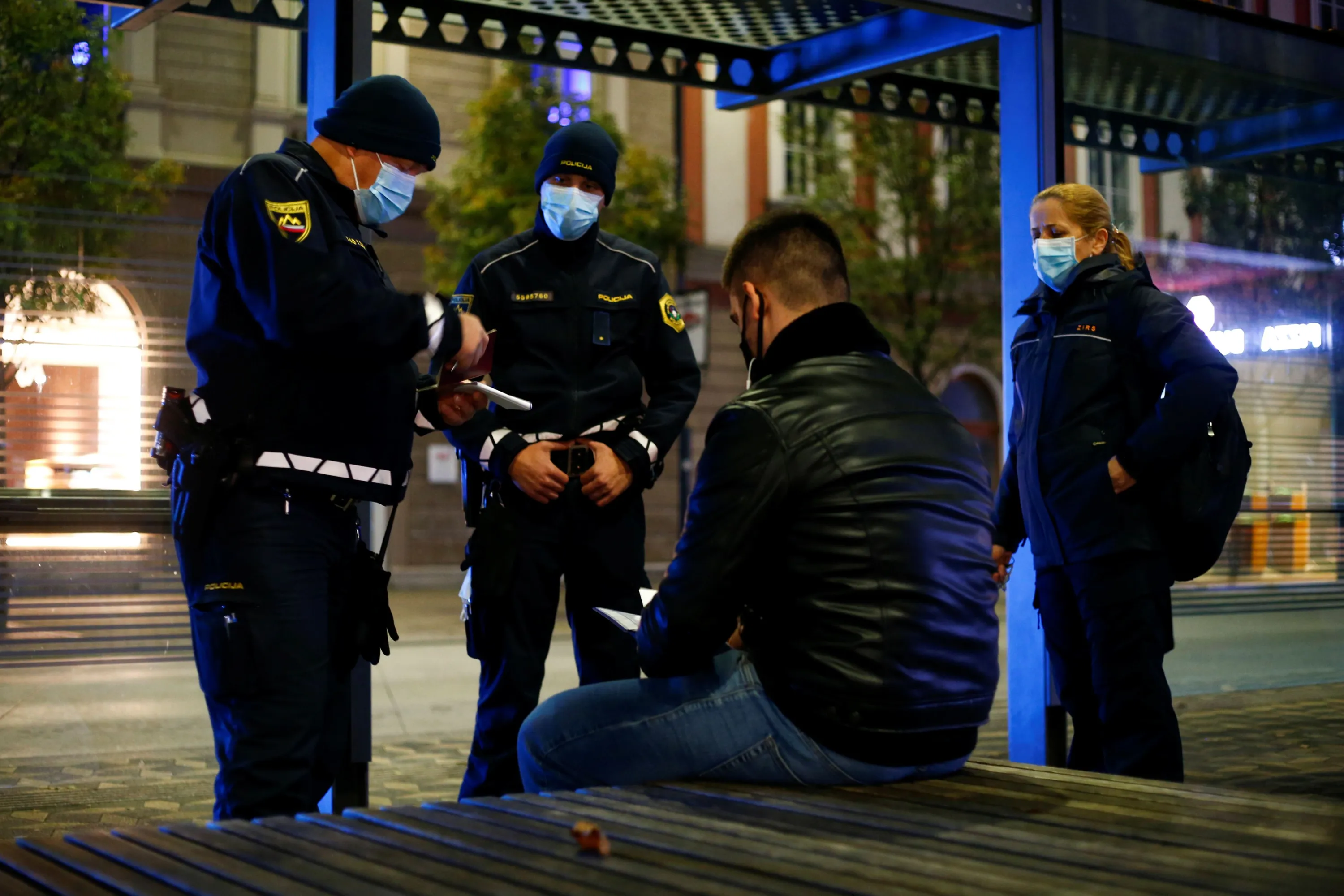 Police officers check the documents of a man as Slovenia starts a nightly curfew from 9 p.m. to 6 a.m as part of a state of emergency called to curb the rising of the coronavirus disease (COVID-19) cases in the country, in Ljubljana, Slovenia, October 20, 2020. (Photo by Borut Zivulovic/Reuters)