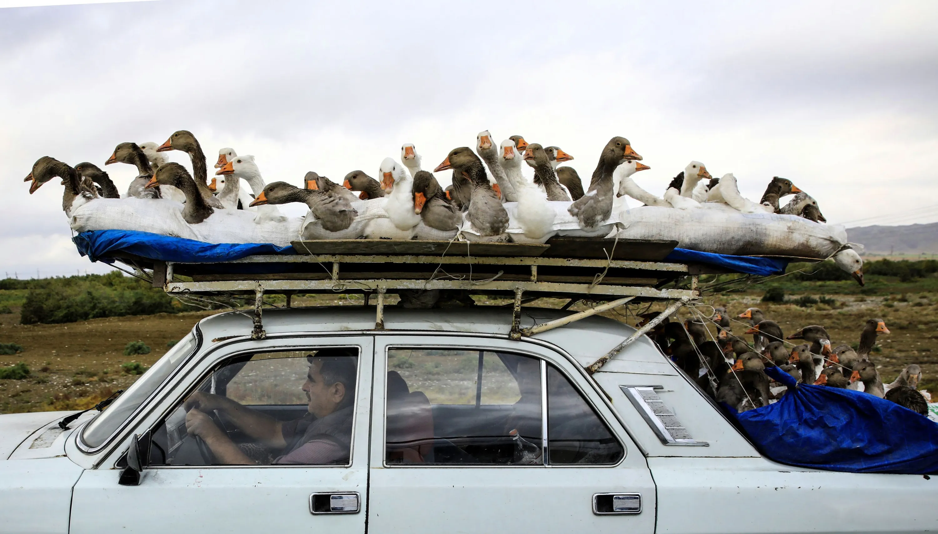 A man carries gooses on top of his car as he drives on a highway that leads to the city of Ganja, Azerbaijan on October 21 2020. (Photo by Umit Bektas/Reuters)