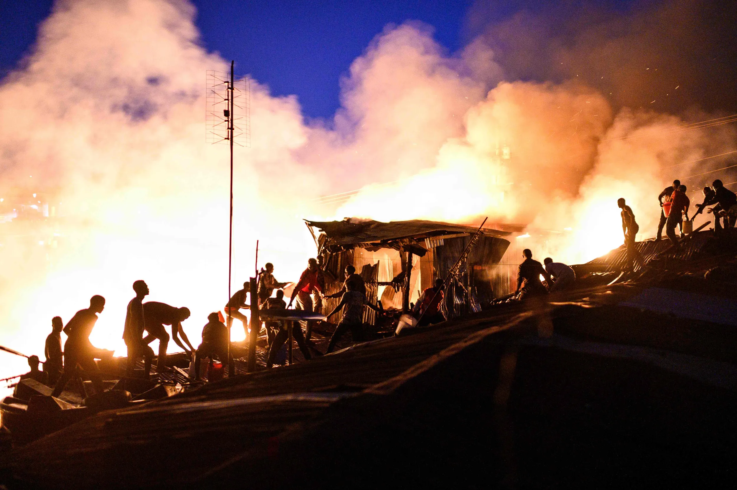 Residents of Kibera form a human-chain as they pass water to extinguish a fire that gutted shantees in the Maranatha area of the sprawling slum that started at dusk in Nairobi on October 14, 2020. About fifty families were left homeless by the inferno that spread unabated despite efforts to douse it using pails and jerrycans as firefighters were unable to access the area due to a lack of access roads. (Photo by Gordwin Odhiambo/AFP Photo)