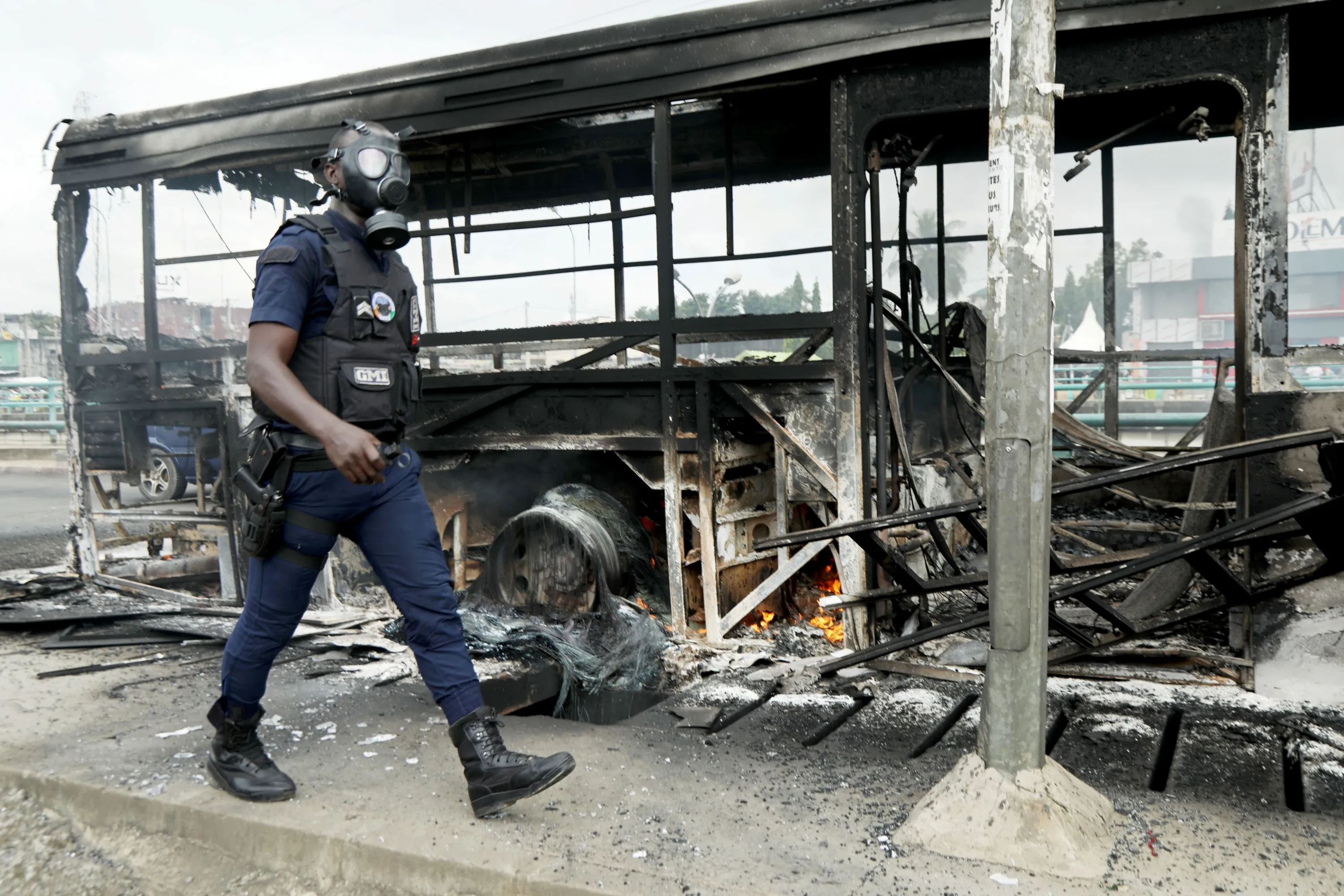 A riot police member walks next to a bus which was burned early in the morning by protesters against the Ivorian President Alassane Ouattara's decision to stand for a third term, in Abidjan, Ivory Coast on October 19, 2020. (Photo by Luc Gnago/Reuters)