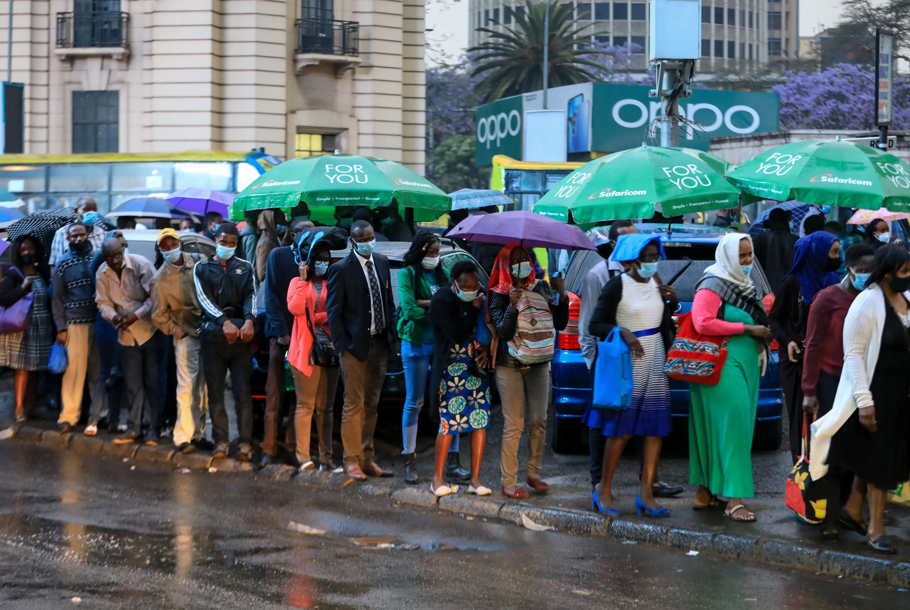 People wearing face masks que at a bus stop without adhering to social distancing as it rains in Nairobi, Kenya, 19 October 2020. In recent days the numbers of COVID-19 coronavirus cases have been on the rise around the country, after the government eased the coronavirus restrictions for economic activities including curfew hours, re-opening of schools and bars which is now feared may trigger a resurgence. (Photo by Daniel Irungu/EPA/EFE)