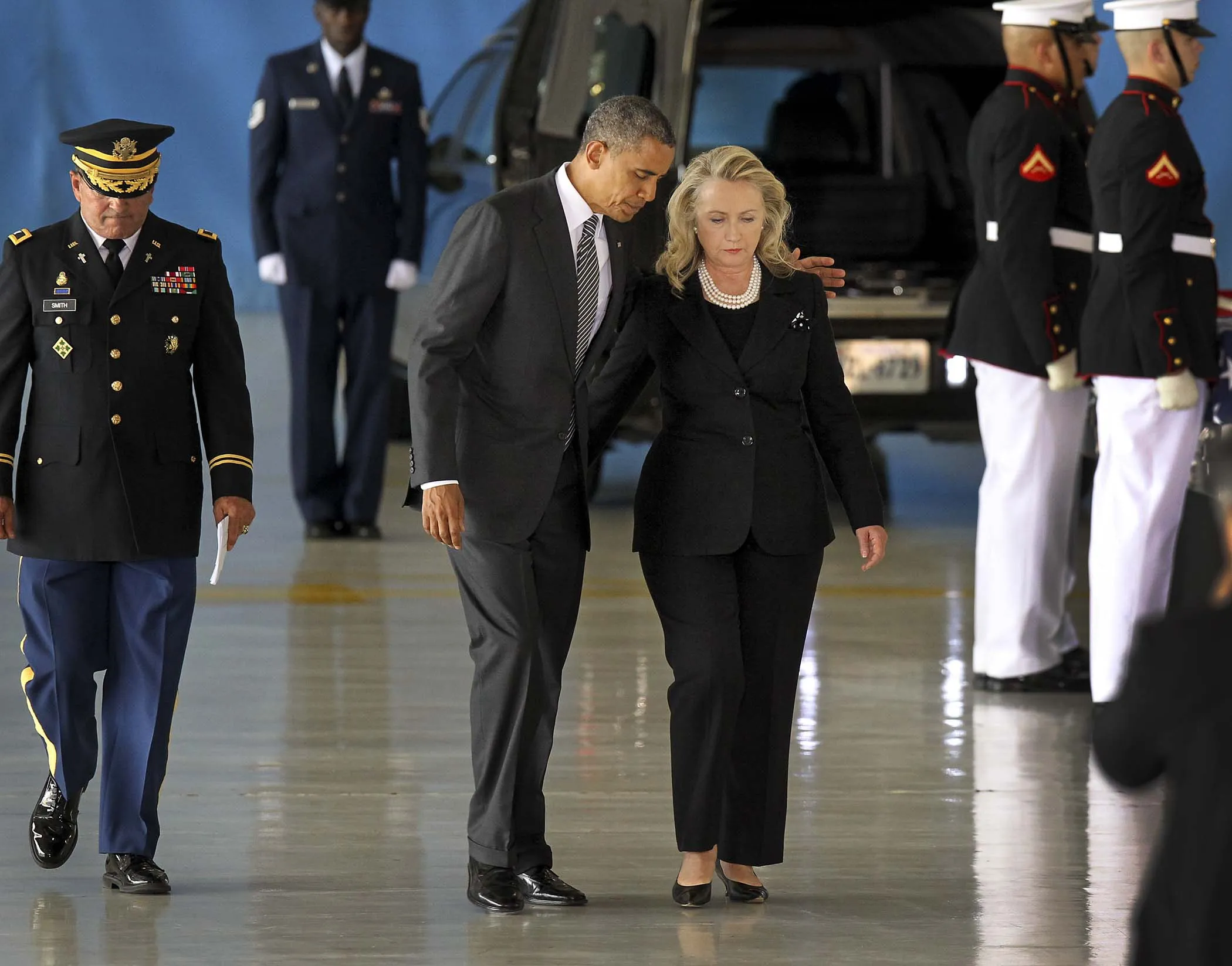 President Barack Obama and Secretary of State Hillary Clinton walk away from the podium during the Transfer of Remains Ceremony marking the return to the United States of the remains of the four Americans killed this week in Benghazi, Libya, at Joint Base Andrews. (Photo by Molly Riley/Polaris via Abaca Press/MCT)