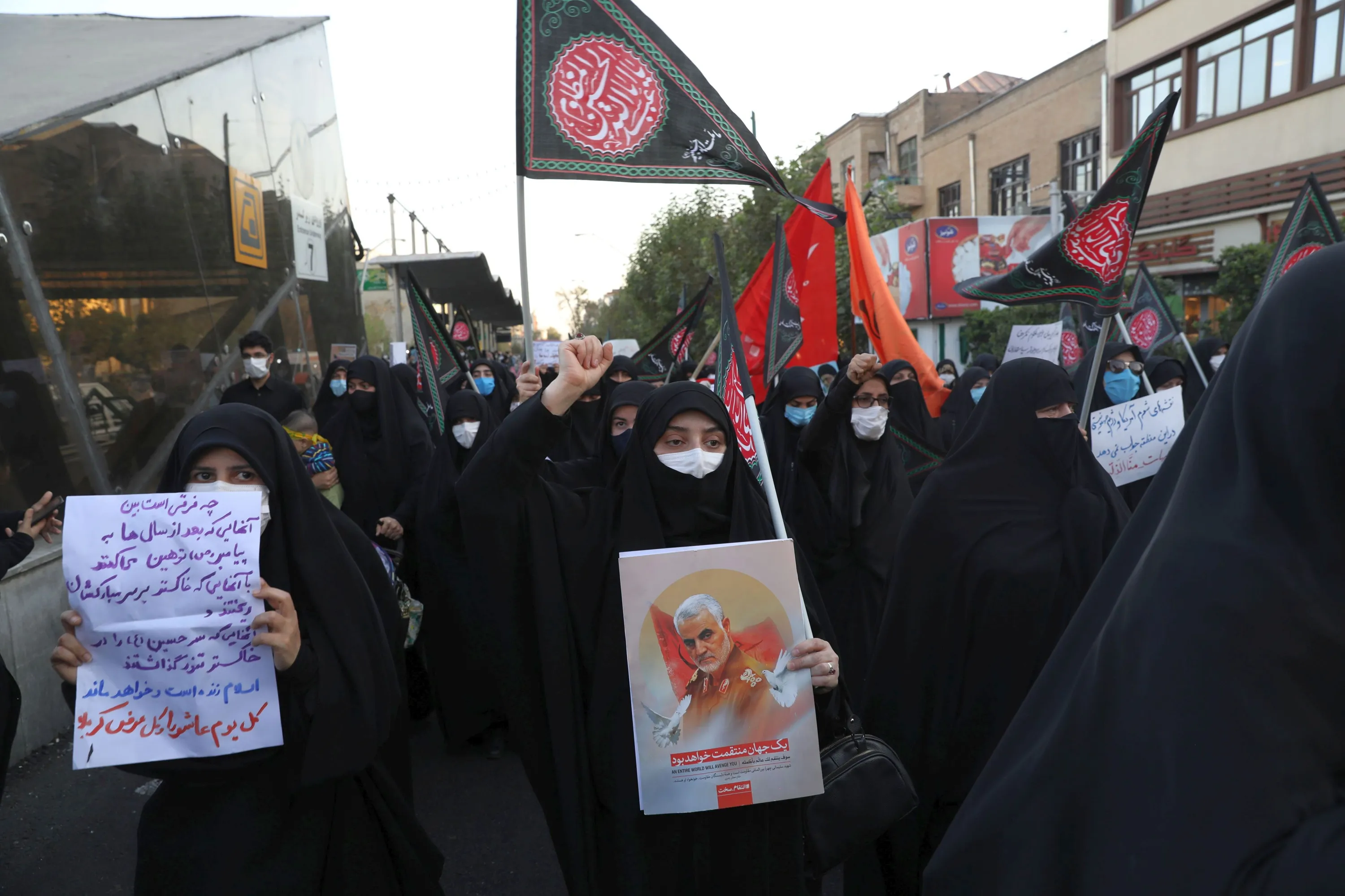 Demonstrators march during a protest to condemn the French magazine Charlie Hebdo for republishing cartoons insulting the Holy Prophet of Islam, in front of the French Embassy in Tehran, Iran, on September 9, 2020. (Photo by Majid Asgaripour/WANA via Reuters)