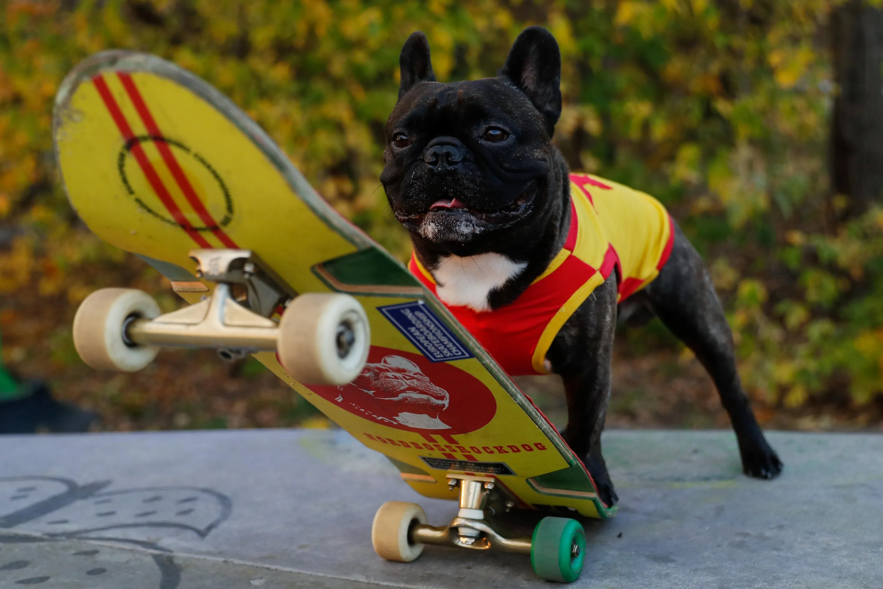 A French Bulldog named Nord Boss stands with his skateboard at a skatepark in the Sokolniki Park in Moscow, Russia on October 14, 2020. (Photo by Evgenia Novozhenina/Reuters)