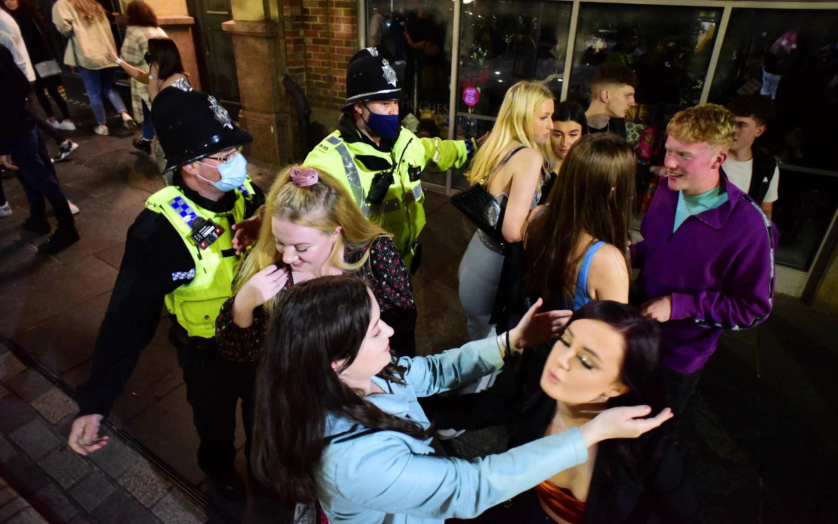 Cops try to clear drinkers gathering outside after the 10pm curfew in Newcastle, United Kingdom on October 23, 2020. British Prime Minister Boris Johnson imposed tougher coronavirus restrictions on an area of the northewest of England after placing Greater Manchester into the government's tier 3, the highest coronavirus alert level, defying local leaders who bitterly opposed the move without extra funding. (Photo by North News and Pictures/The Sun)