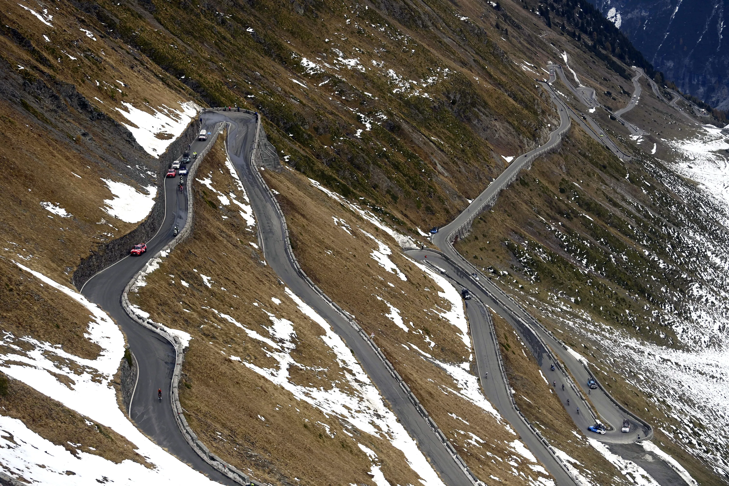 Cyclists climb the Stelvio Pass, 2,757 meters (9,045 ft) above sea level, during the 18th stage of the Giro d'Italia cycling race from Pinzolo to Laghi di Cancano, northern Italy, Thursday, October 22, 2020. (Photo by Fabio Ferrari/LaPresse via AP Photo)