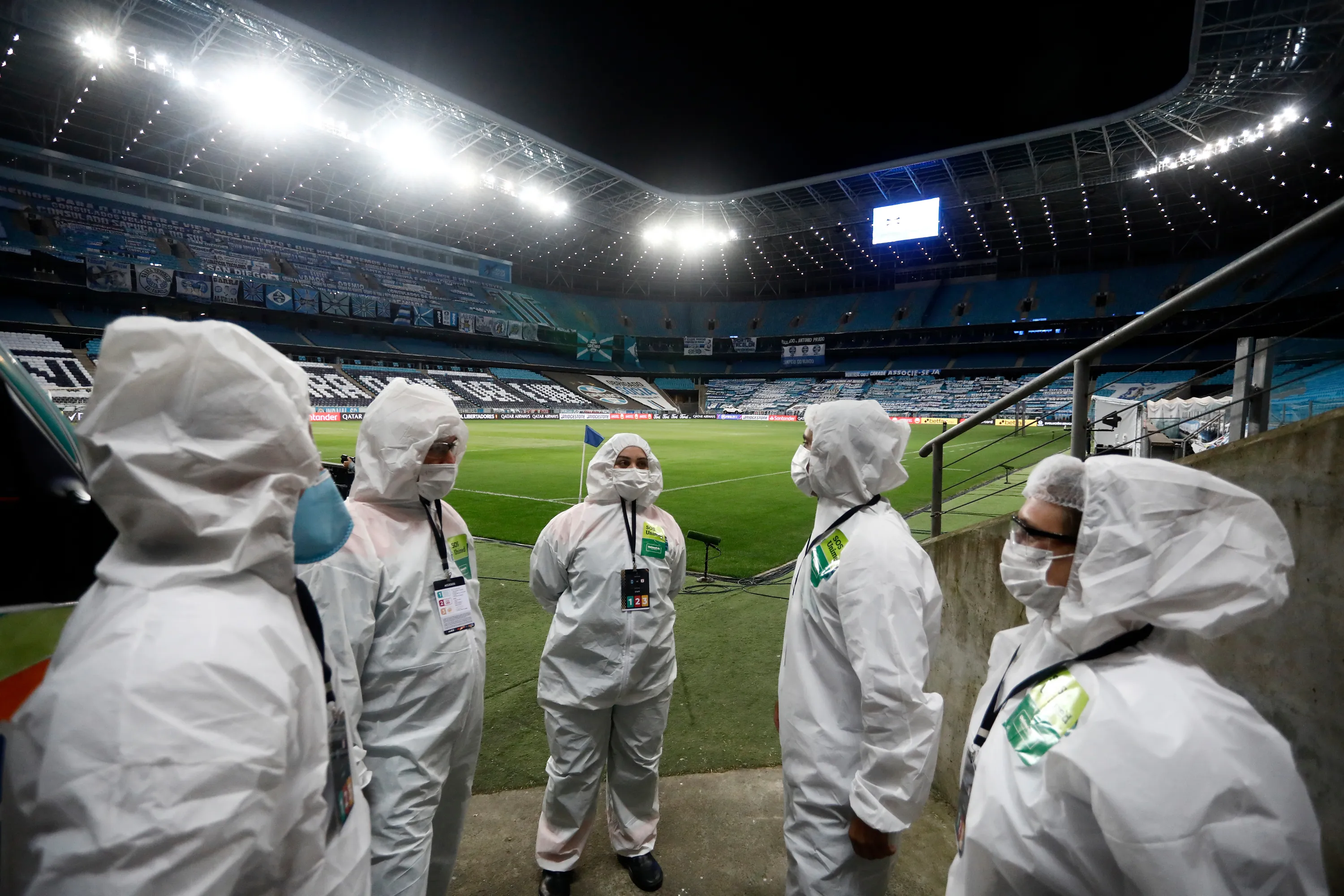 Medical staff wearing PPE gather next to an ambulance at pitch side of an empty Arena Do Gremio due to coronavirus restrictions before a Group E match of Copa CONMEBOL Libertadores 2020 between Gremio and América de Cali aon October 22, 2020 in Porto Alegre, Brazil. (Photo by Diego Vara – Pool/Getty Images)