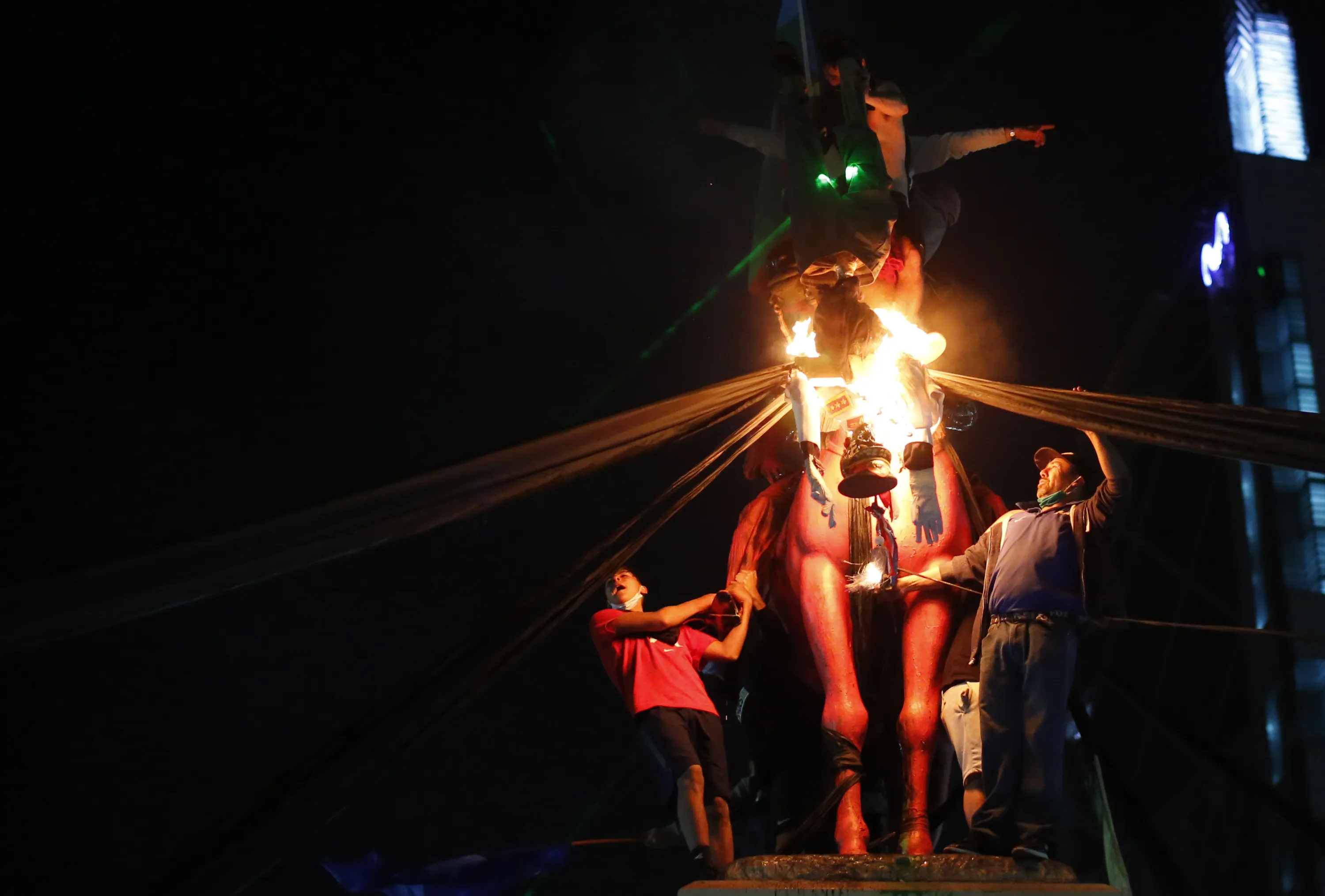 Demonstrators burn a doll depicting Gen. Augusto Pinochet on the day Chileans voted in a referendum to decide whether the country should replace its 40-year-old constitution, written during the dictatorship of Gen. Augusto Pinochet, in Santiago, Sunday, October 25, 2020. (Photo by Luis Hidalgo/AP Photo)