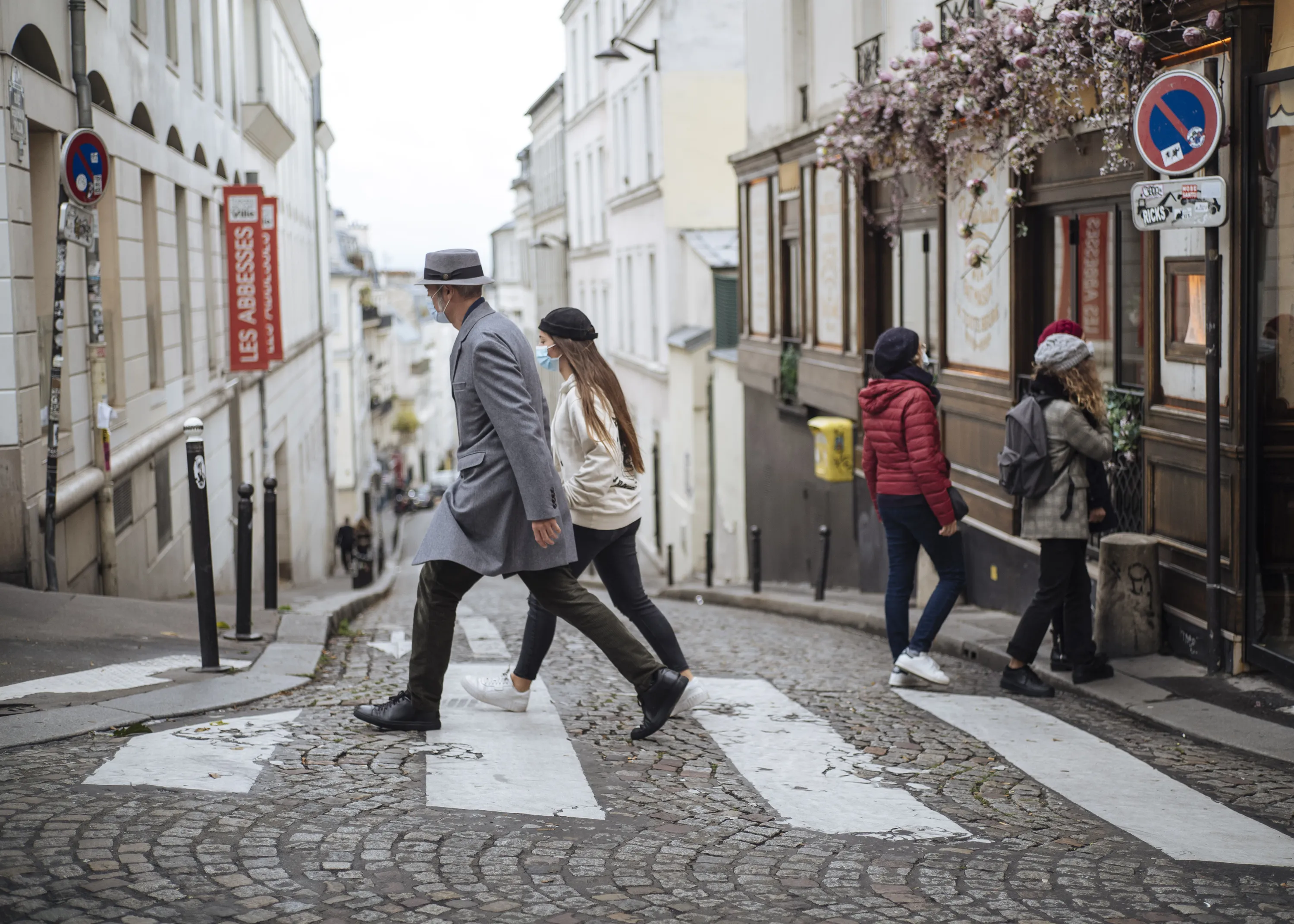 People wearing face masks walk, in the Montmartre district of Paris, Sunday October 25, 2020. A curfew intended to curb the spiraling spread of the coronavirus, has been imposed in many regions of France including Paris and its suburbs. (Photo by Lewis Joly/AP Photo)