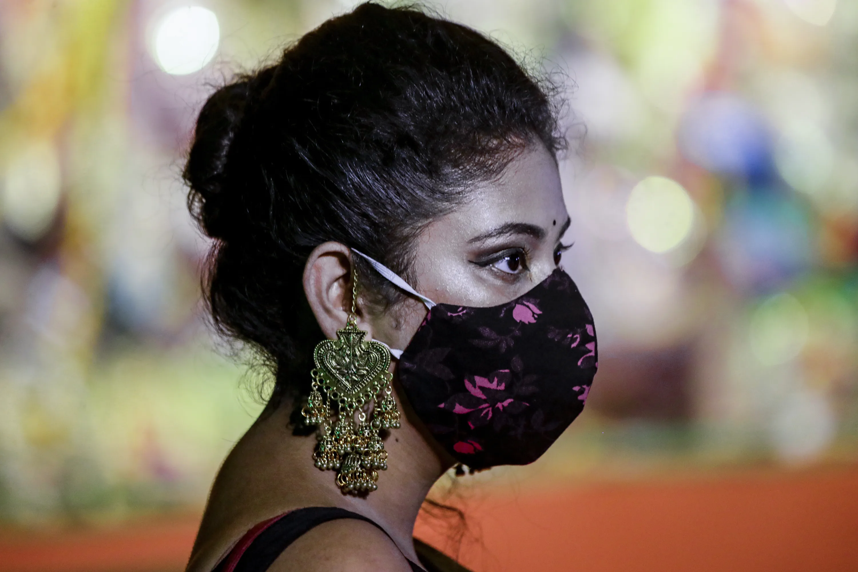 A Hindu devotee wearing face mask and ornaments visits an almost deserted worship venue of Hindu goddess Durga during Durga Puja, the biggest festival of the region, in Kolkata, India, Sunday, October 25, 2020. The Hindu festival season is traditionally laced with an unmatched fanfare and extravaganza, with socializing being the hallmark of the celebration. But because of the coronavirus pandemic this year's festivities have started on a pale note. (Photo by Bikas Das/AP Photo)
