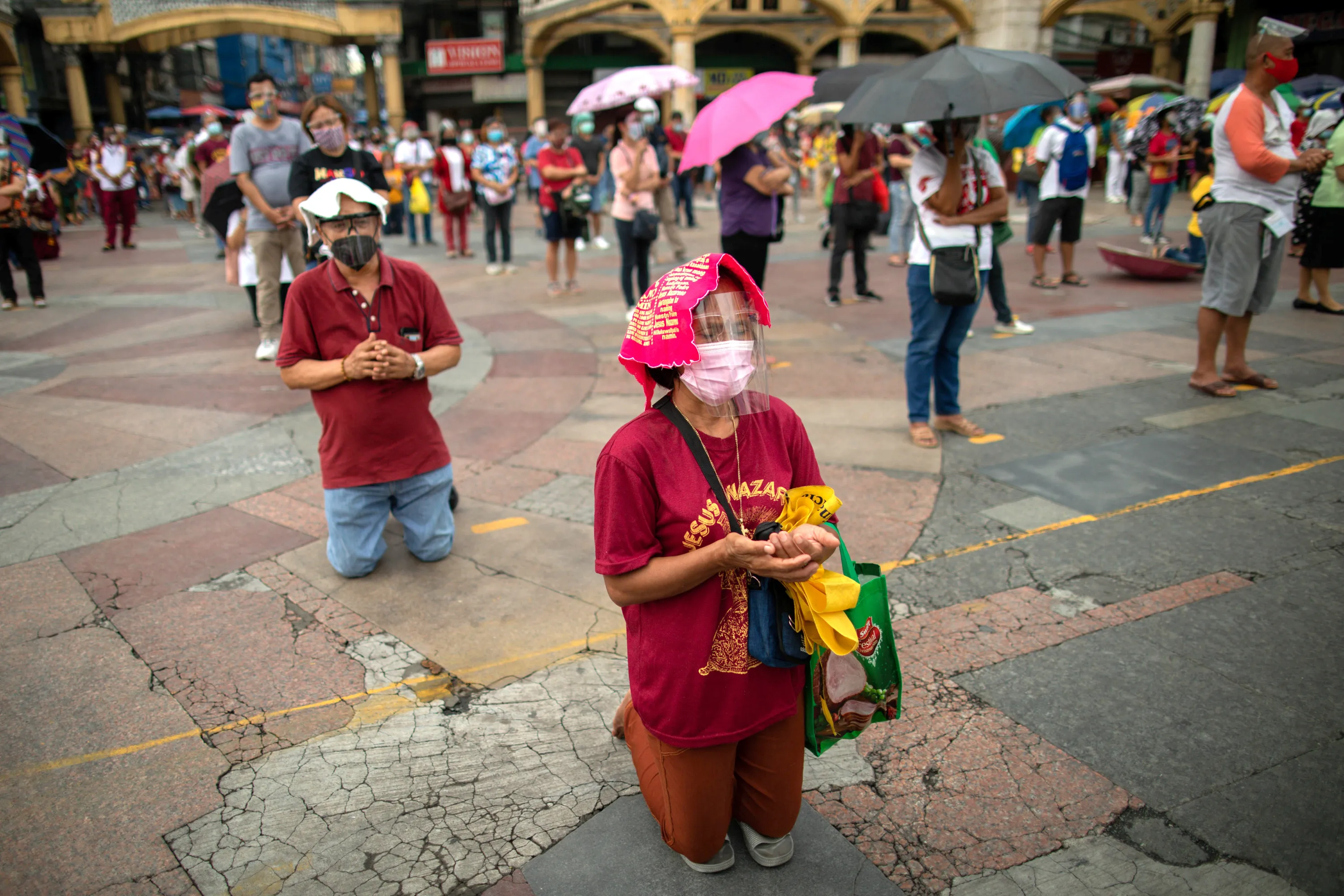 Filipino devotees attend mass while maintaining social distancing outside the Minor Basilica of the Black Nazarene, amid the coronavirus disease (COVID-19) outbreak, in Quiapo, Manila, Philippines, October 2, 2020. (Photo by Eloisa Lopez/Reuters)