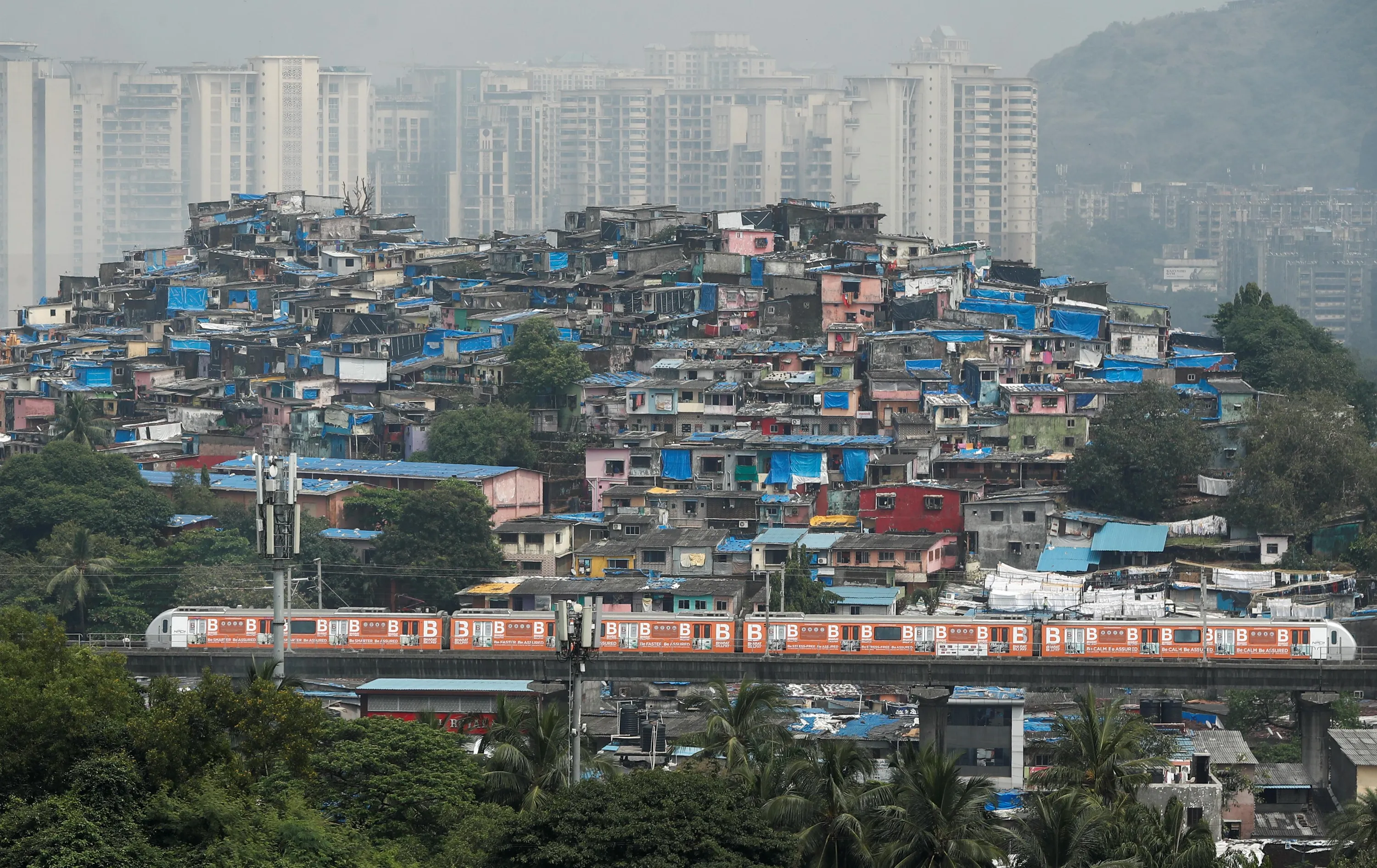 A metro train moves past slums and buildings after the restart of its operations, amidst the spread of the coronavirus disease (COVID-19), in Mumbai, India October 19, 2020. (Photo by Francis Mascarenhas/Reuters)