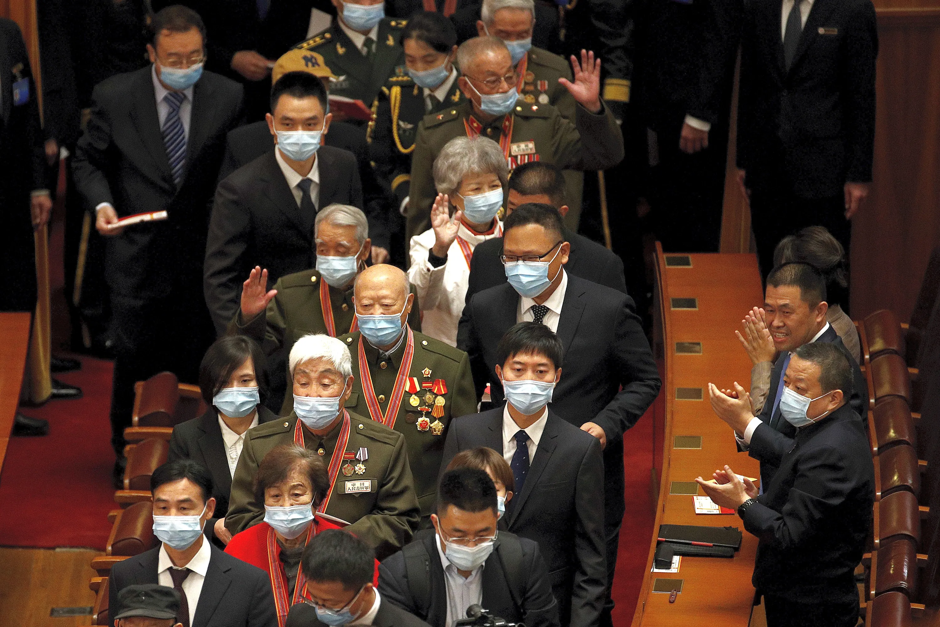 Delegates wearing face masks to help curb the spread of the coronavirus applaud as masked veteran soldiers arrive to attend the commemorating conference on the 70th anniversary of China’s entry into the 1950-53 Korean War, at the Great Hall fo the People in Beijing, Friday, October 23, 2020. (Photo by Andy Wong/AP Photo)