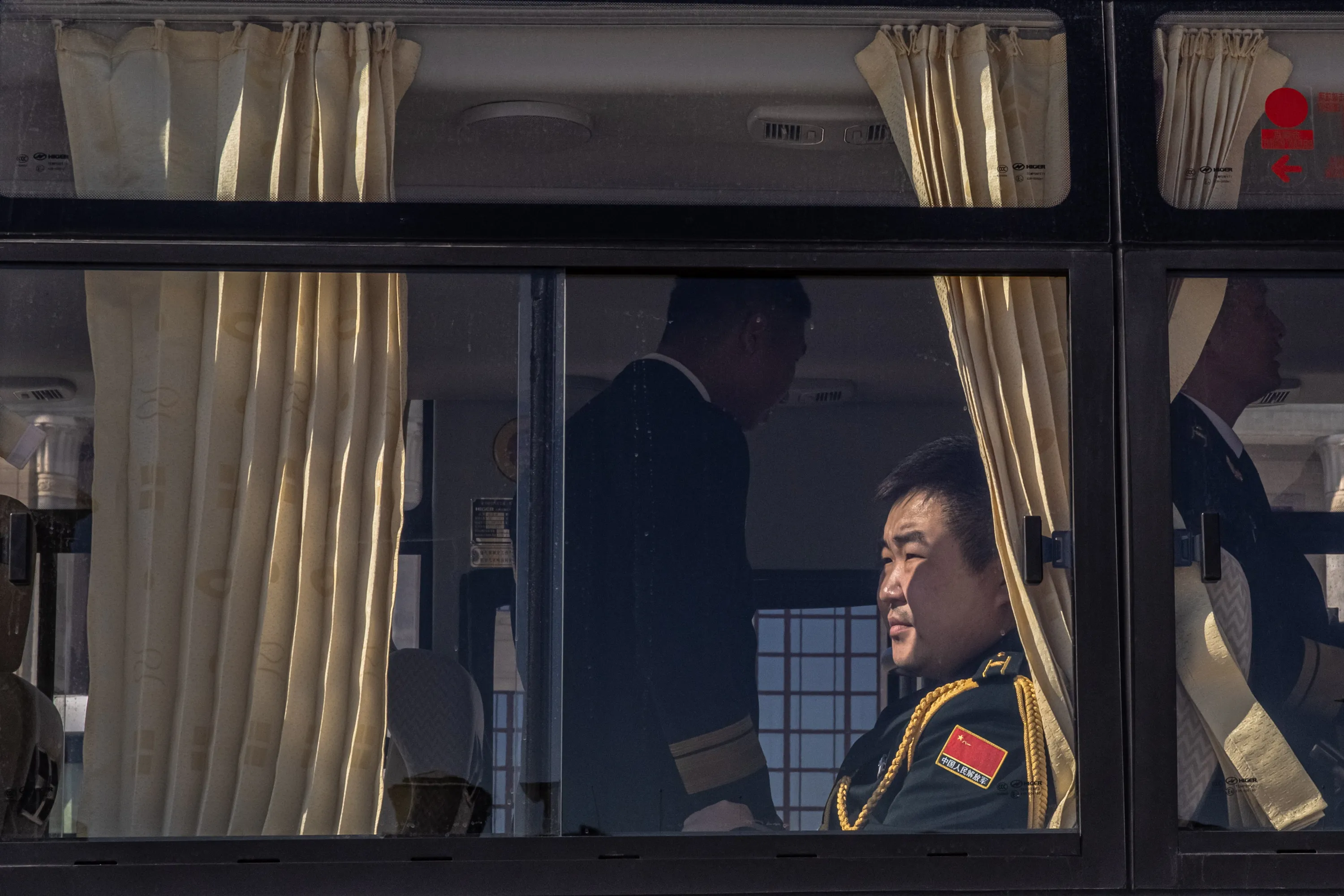 A member of the Chinese military orchestra sits on a bus as he leaves after the event at the Great Hall of the People marking the 70th anniversary of China's entry into the Korean war, in Beijing, China, 23 October 2020. (Photo by Roman Pilipey/EPA/EFE)