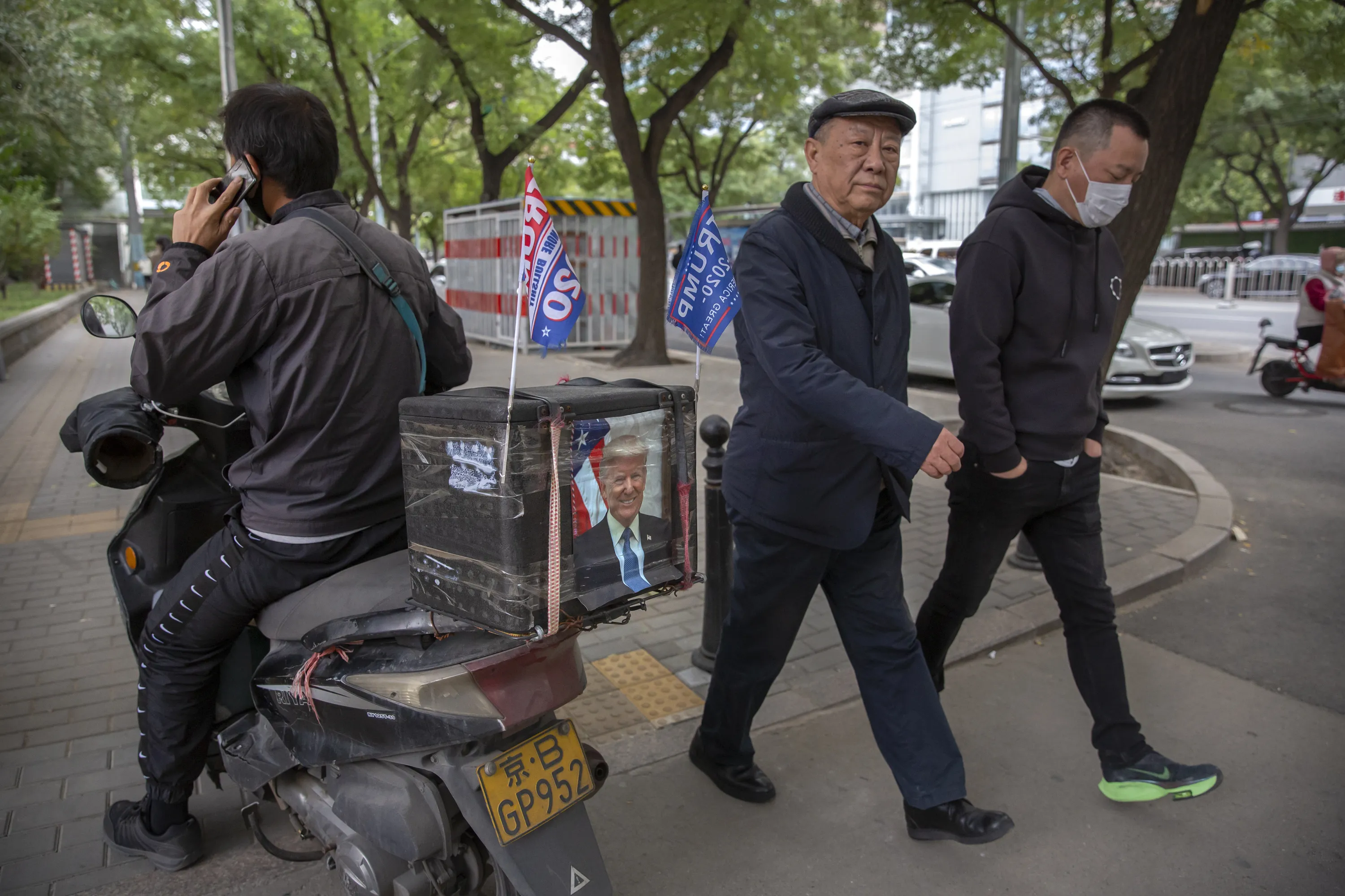 A delivery courier rides a motorbike decorated with a portrait of U.S. President Donald Trump and “Trump 2020” flags in Beijing, Wednesday, October 14, 2020. Chinese leaders hope Washington will tone down conflicts over trade, technology and security if Joe Biden wins the Nov. 3 presidential election. But any shift is likely to be in style, not substance, as frustration with Beijing increases across the American political spectrum. (Photo by Mark Schiefelbein/AP Photo)