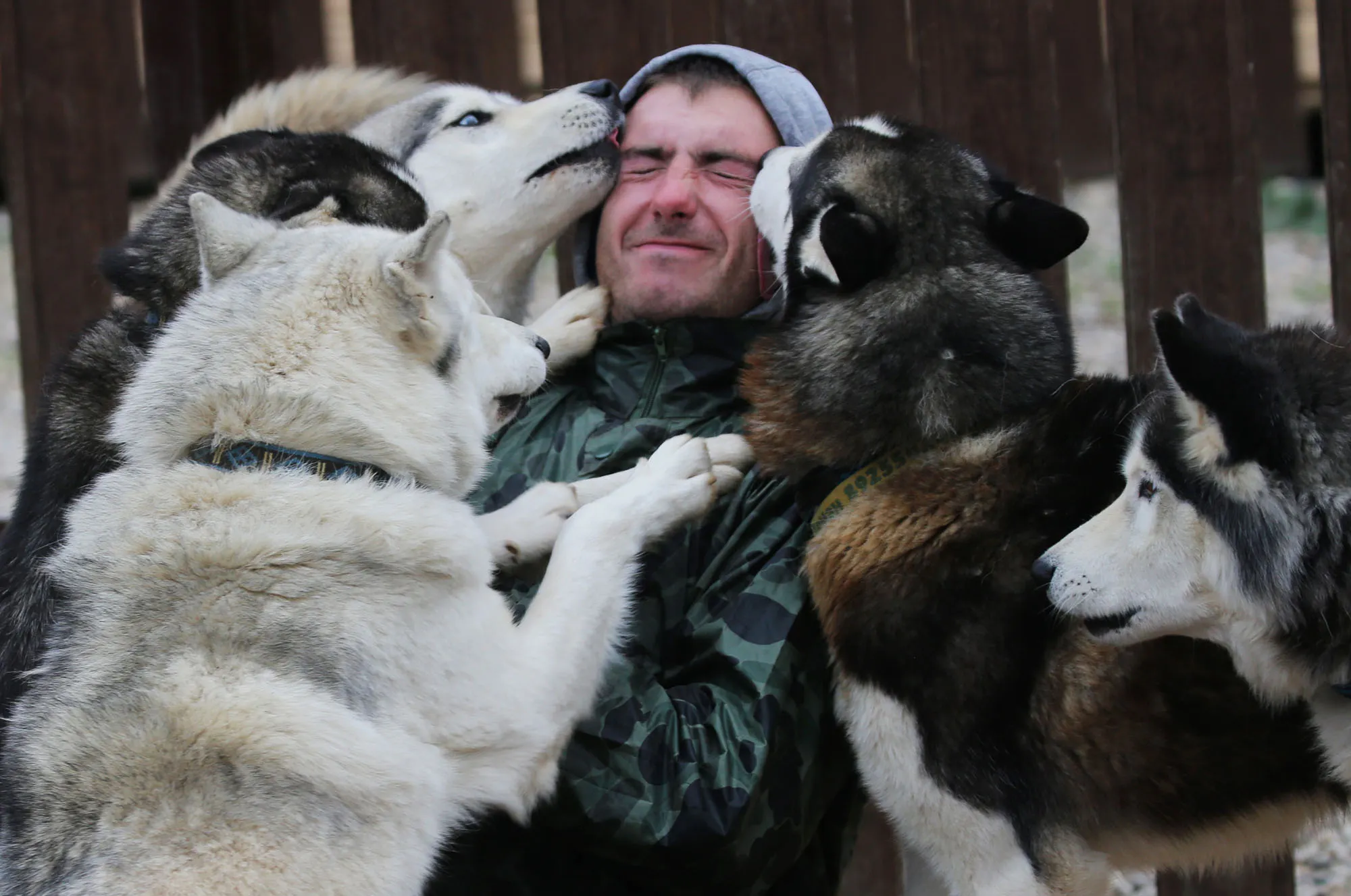 Dogs lick employee at the Husky Villiage Ruzskaya Alaska Kennel on October 17, 2020 in Baranovo, Russia. More than 130 Siberian Husky and Samoed dogs live in a private shelter, organized by lawer Natalia Basina. Most dogs in the shelter were founded on the streets, or handed over by owner who could not cope with animals of these breeds, which were fashionable among urban residents in early 2000s. (Photo by Mikhail Svetlov/Getty Images)