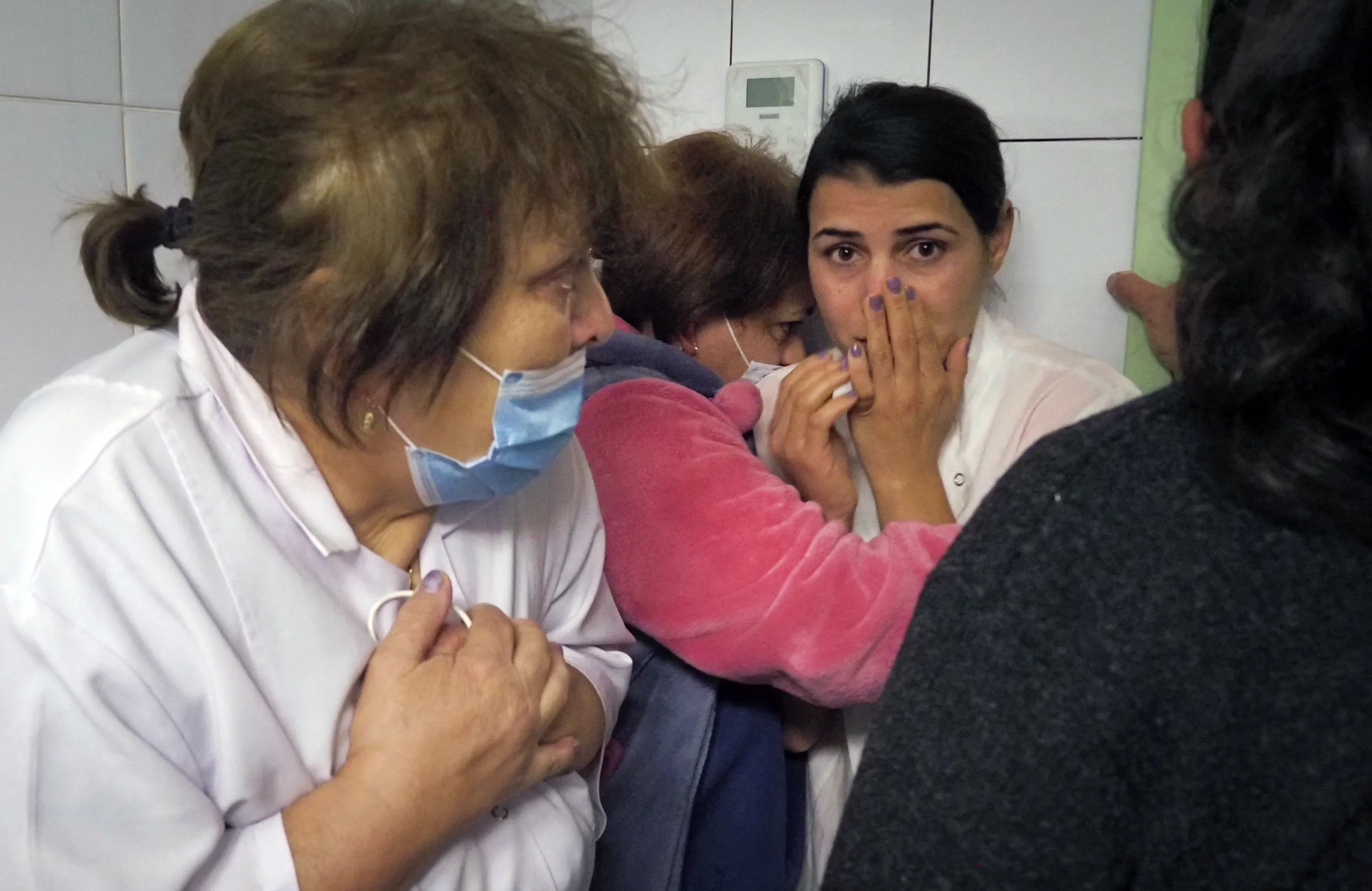 Medical workers react hiding in a basement of a hospital during shelling by Azerbaijan's artillery in Stepanakert, the separatist region of Nagorno-Karabakh, Wednesday, October 28, 2020. (Photo by AP Photo/Stringer)