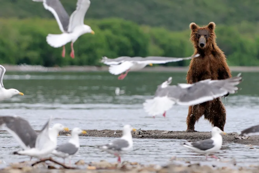 Bear with seagulls/n South Kamchatka Sanctuary<><>South Kamchatka Sanctuary; seagull; Kamchatka; bear; Kuril Lake