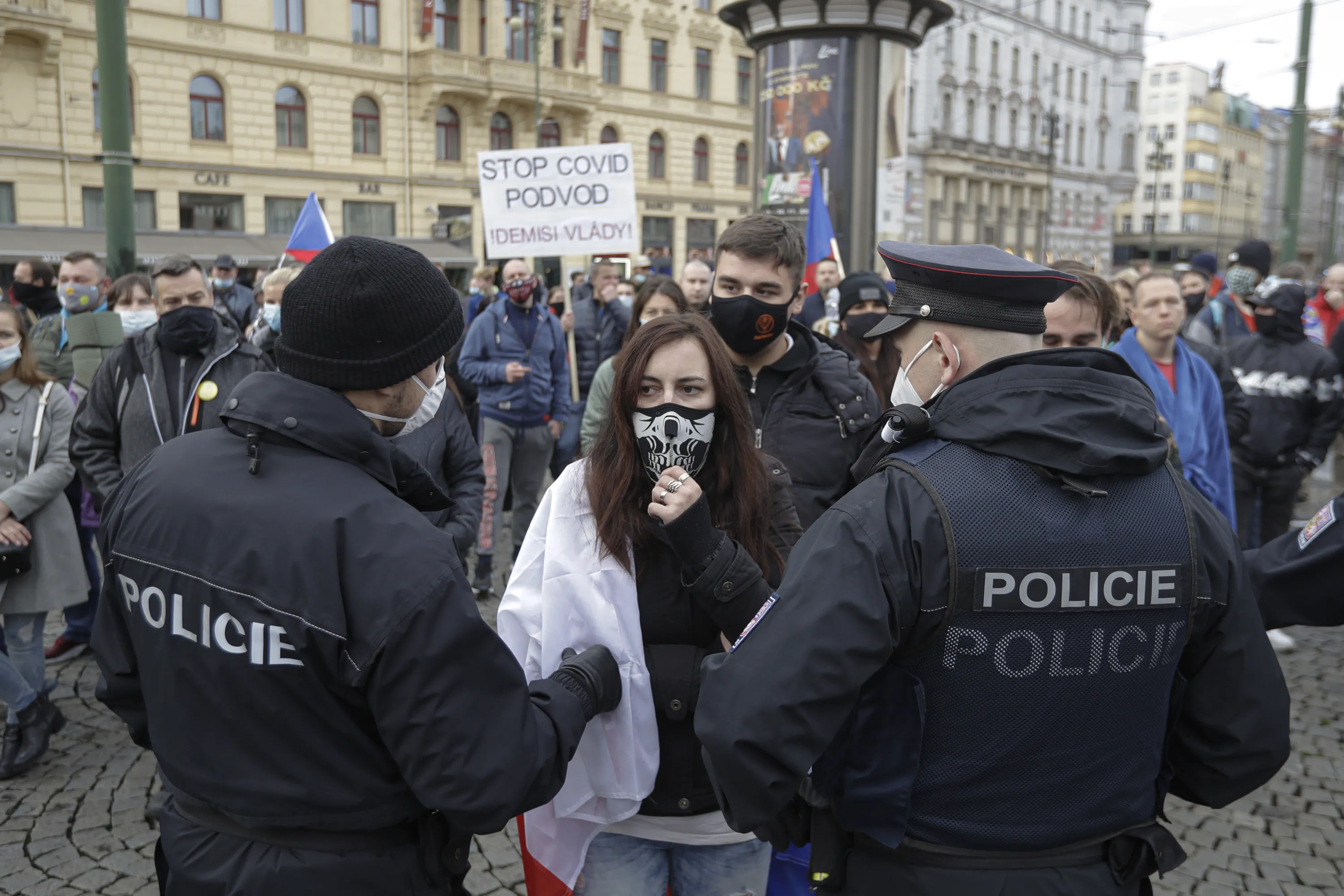 Demonstrators gather to protest the COVID-19 preventative measures downtown Prague, Czech Republic, Wednesday, October 28, 2020. (Photo by Petr David Josek/AP Photo)