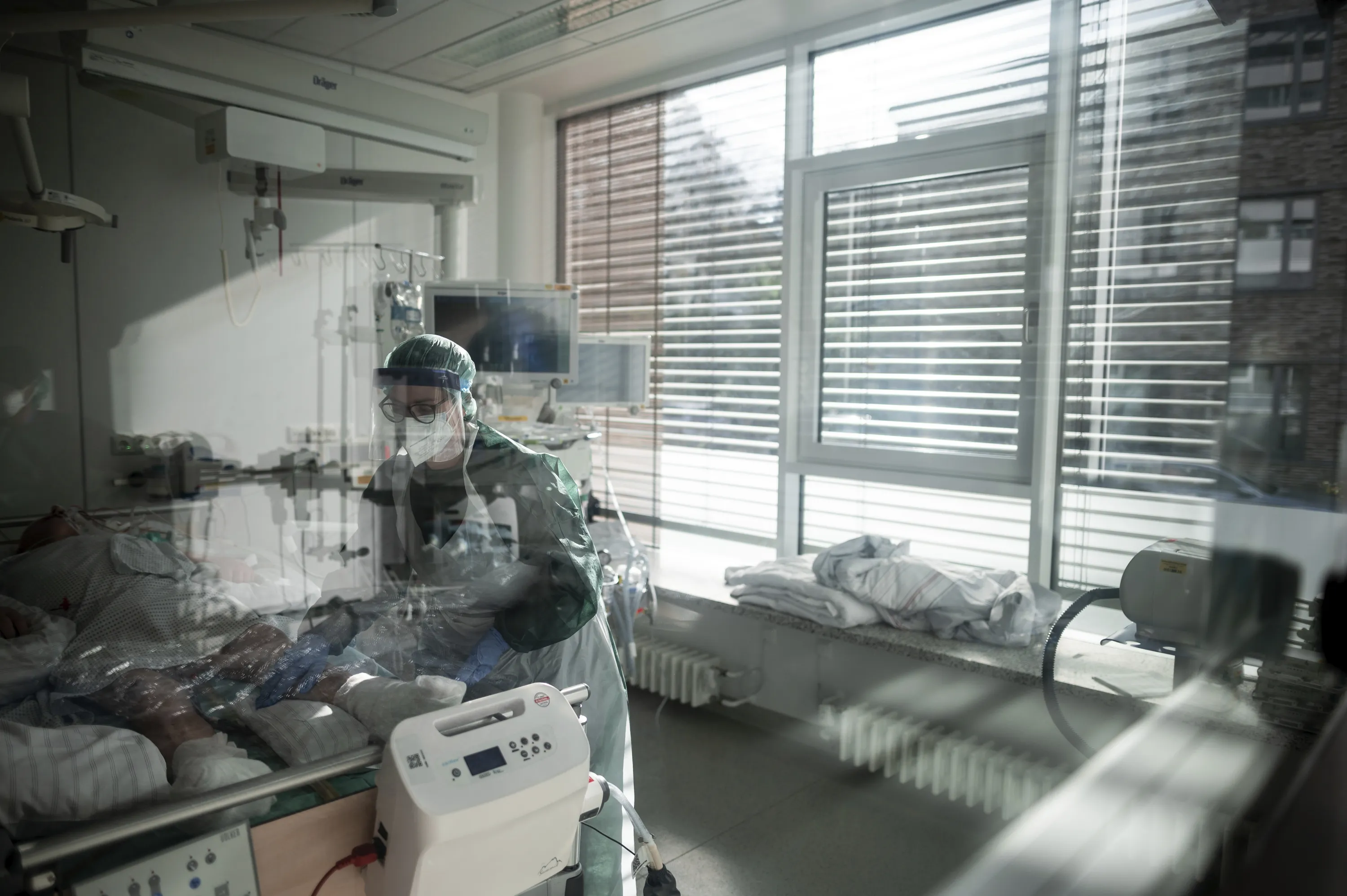 Nursing staff in protective equipment cares for a corona patient in a hospital in Essen, Germany, Wednesday, October 28, 2020. People with a new coronavirus infection are treated in the intensive care unit IT2 in the Operative Centre II of the University Hospital Essen. (Photo by Fabian Strauch/dpa via AP Photo)
