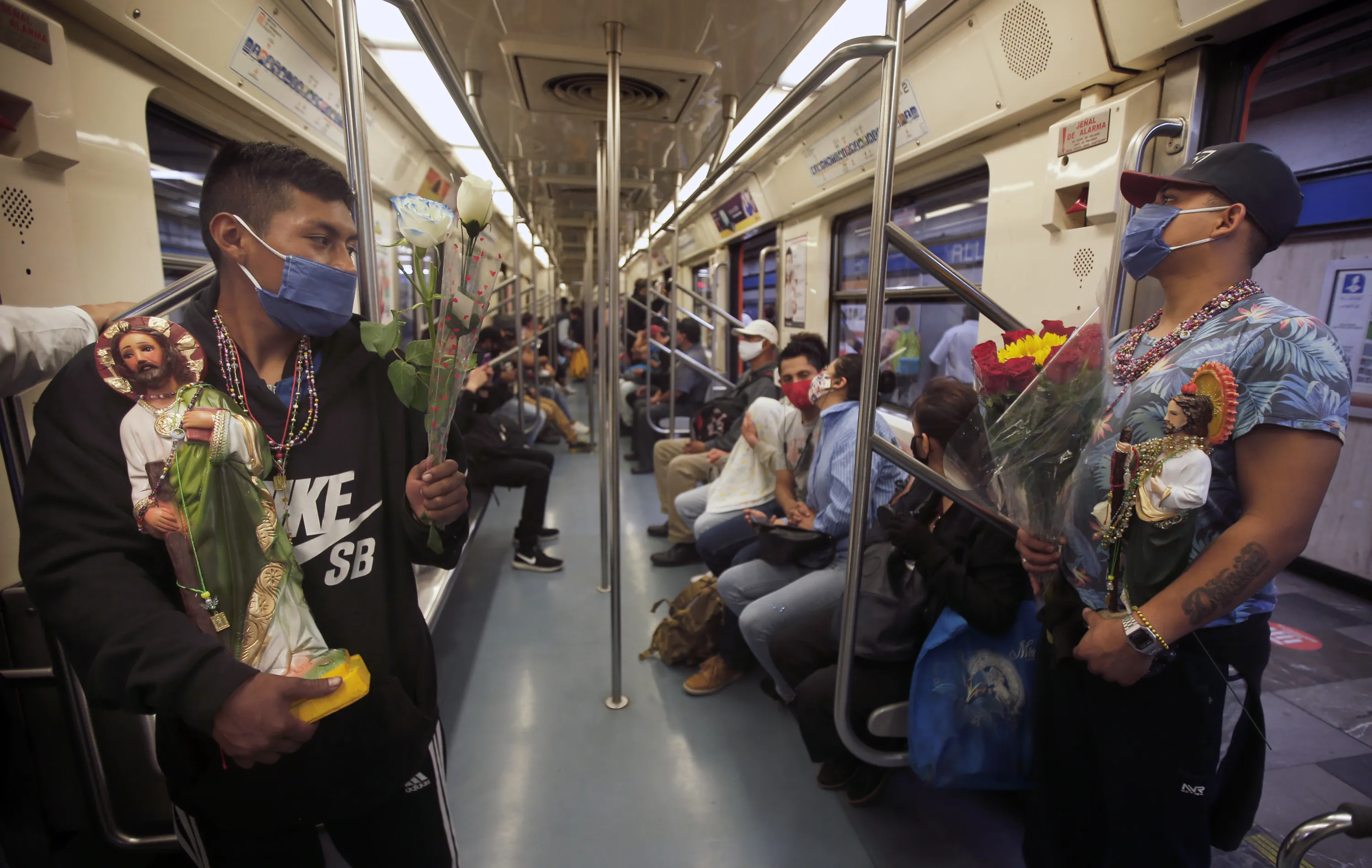 Devotees travel on the subway with their Saint Jude statues during the annual pilgrimage honoring Jude, the patron saint of lost causes, in Mexico City, Wednesday, October 28, 2020. Thousands of Mexicans did not miss this year to mark St. Jude's feast day, but the pandemic caused Masses to be canceled and the rivers of people of other years outside the San Hipolito Catholic church were replaced by orderly lines of masked worshipers waiting their turn for a blessing. (Photo by Marco Ugarte/AP Photo)