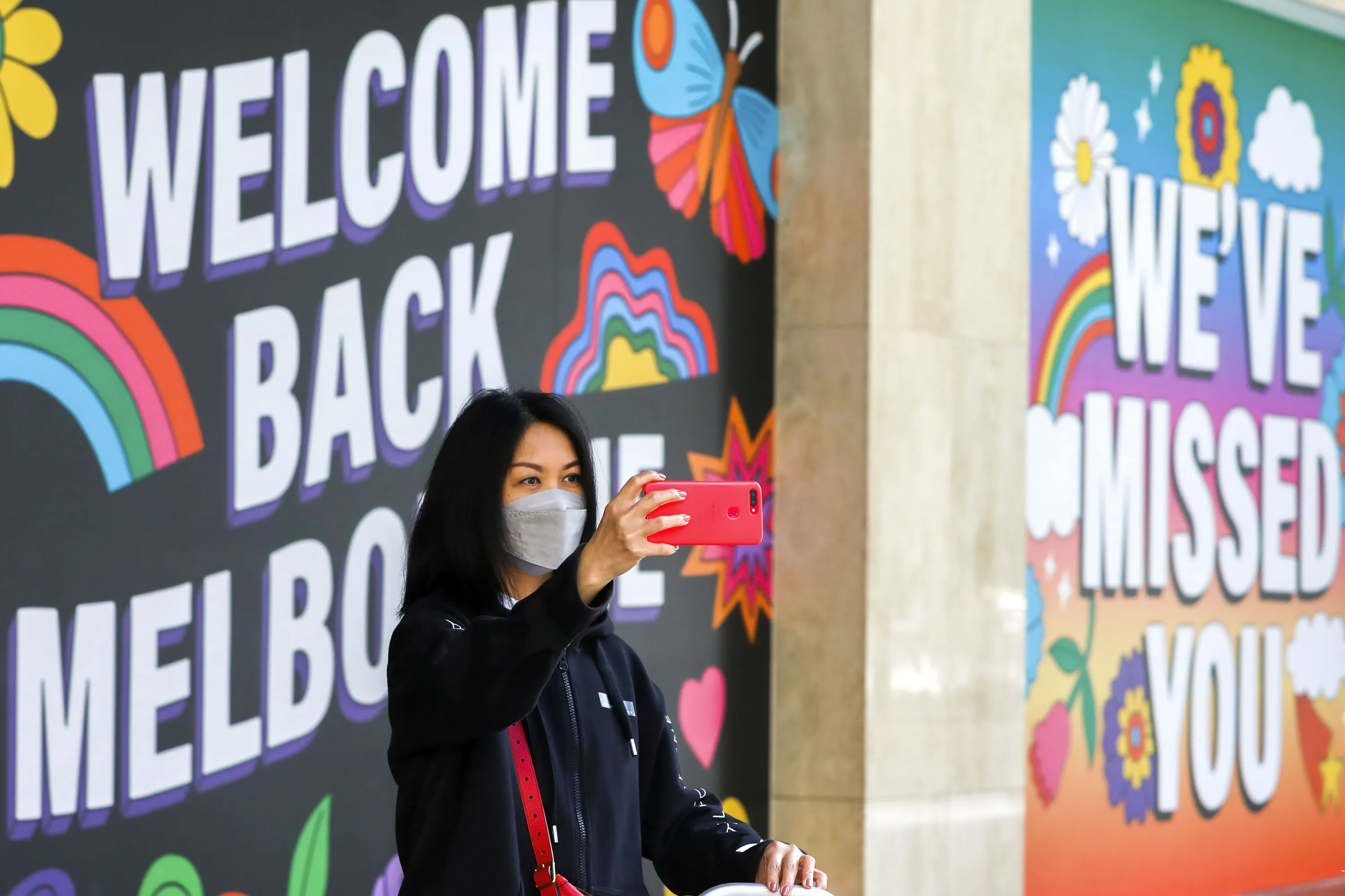 A woman takes a selfie in front of signage in Melbourne, Australia, Wednesday, October 28, 2020. Australia’s second largest city of Melbourne which was a coronavirus hotspot emerges from a nearly four-months lockdown, with restaurants, cafes and bars opening and outdoor contact sports resuming on Wednesday. (Photo by Asanka Brendon Ratnayake/AP Photo)