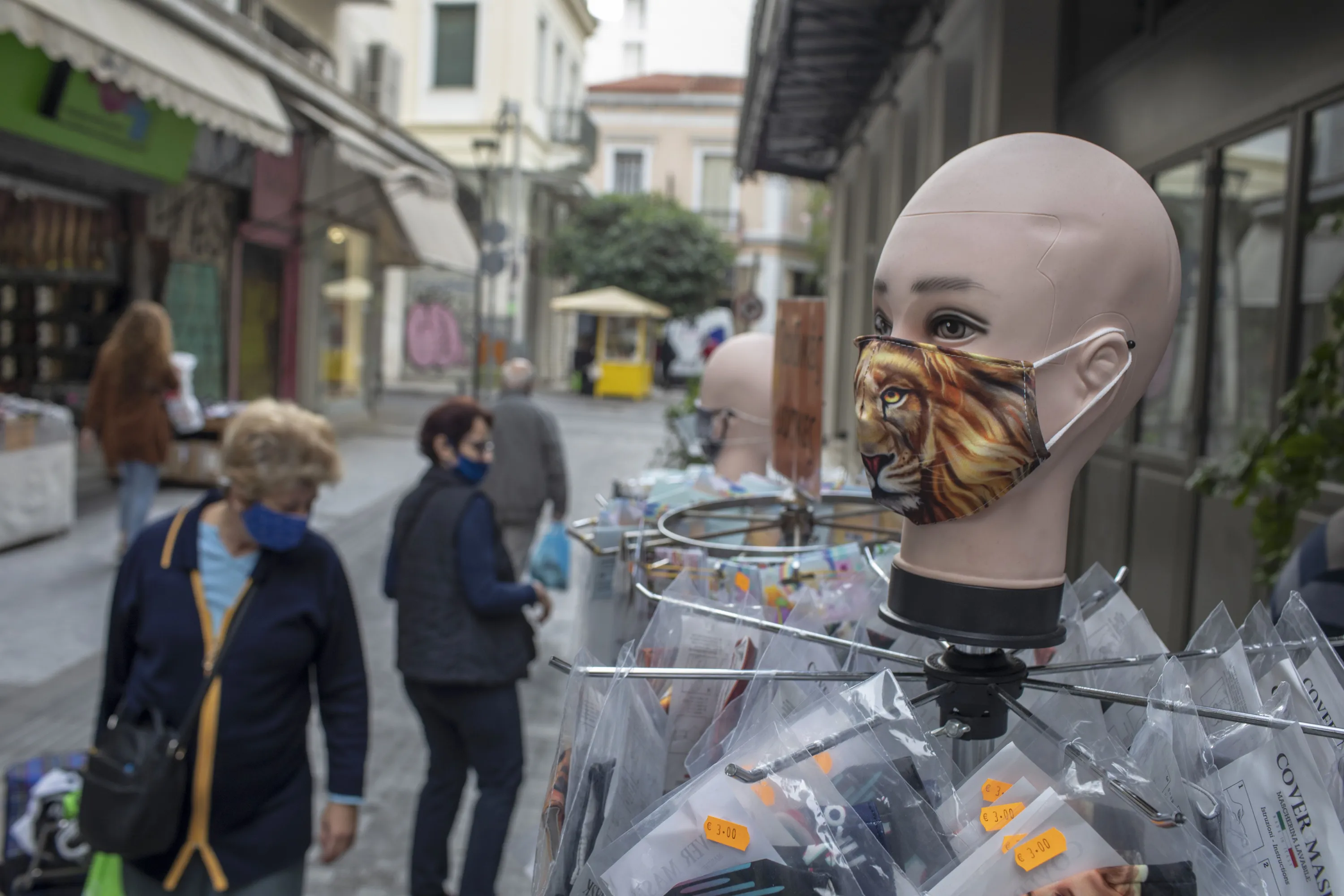 Women walk past a dummy wearing a face mask, in central Athens, Thursday, October 29, 2020. Greece is seeing a record-breaking jump in the number of confirmed COVID-19cases for the second consecutive day, with 1,547 new cases announced Wednesday, Oct 28, and 10 new deaths. (Photo by Petros Giannakouris/AP Photo)