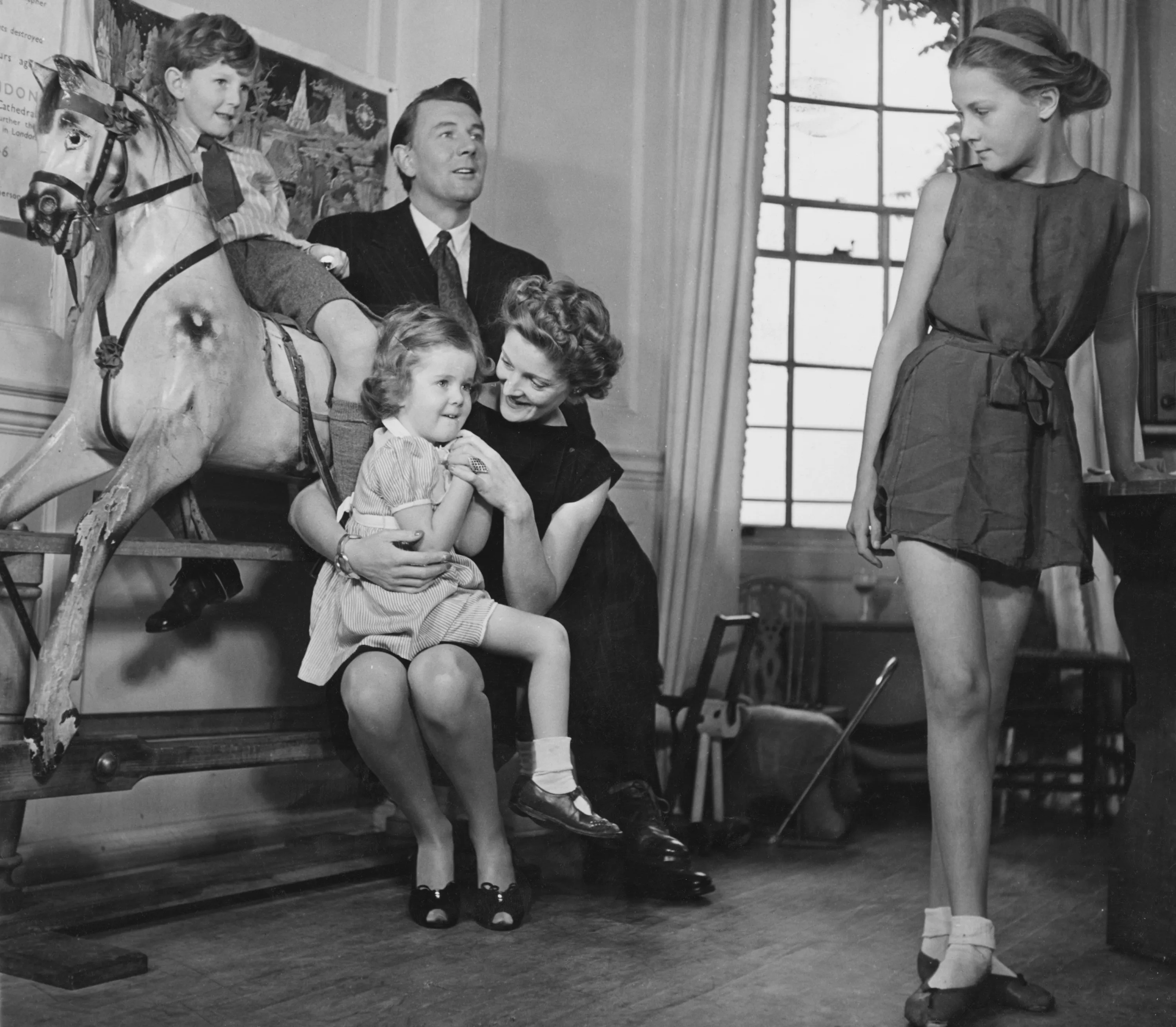 Married British actors Michael Redgrave (1908 - 1985) and Rachel Kempson (1910 - 2003) with their children (left to right) Corin, Lynn and Vanessa, 31st October 1946. (Photo by George Konig/Keystone Features/FPG/Hulton Archive/Getty Images)