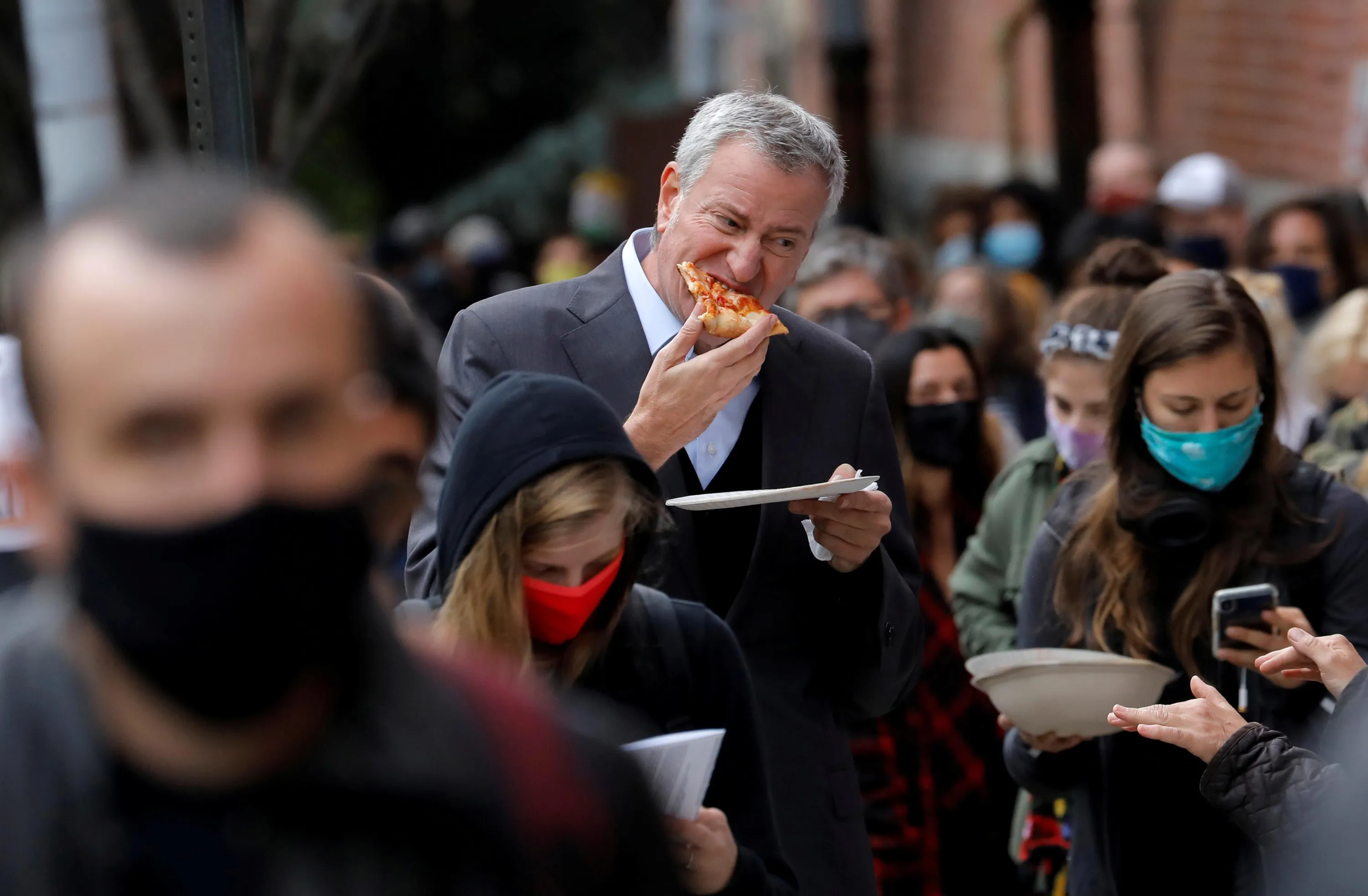 New York City Mayor Bill de Blasio eats pizza as he stands in line with hundreds of other voters for several hours to cast his ballot during early voting in the Brooklyn borough of New York City, New York, U.S., October 27, 2020. (Photo by Mike Segar/Reuters)