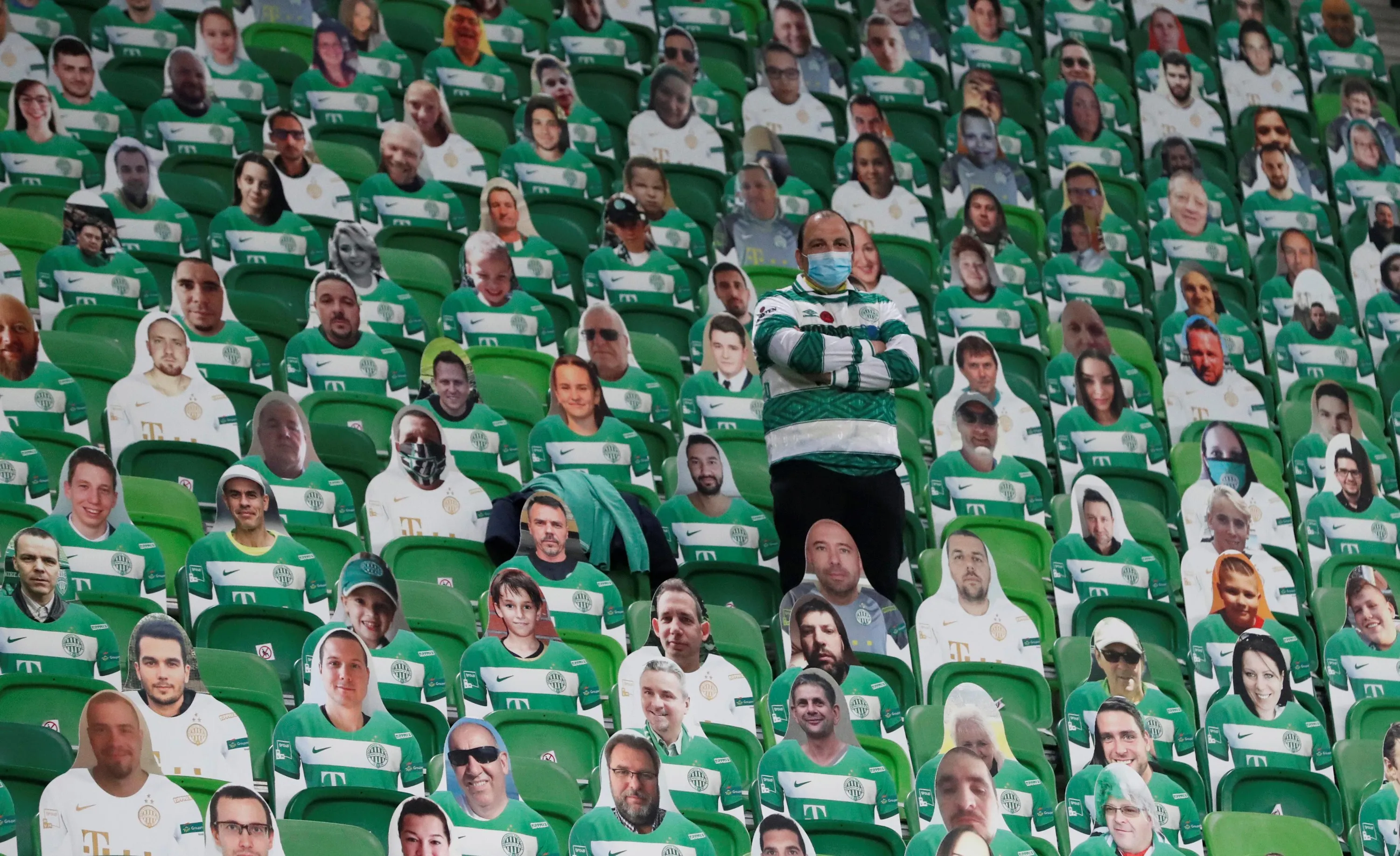 A fan wearing a balaclava inside the stadium before the Champions League match between Ferencvaros and Dynamo Kyiv in Budapest, Hungary on October 28, 2020. (Photo by Bernadett Szabo/Reuters)