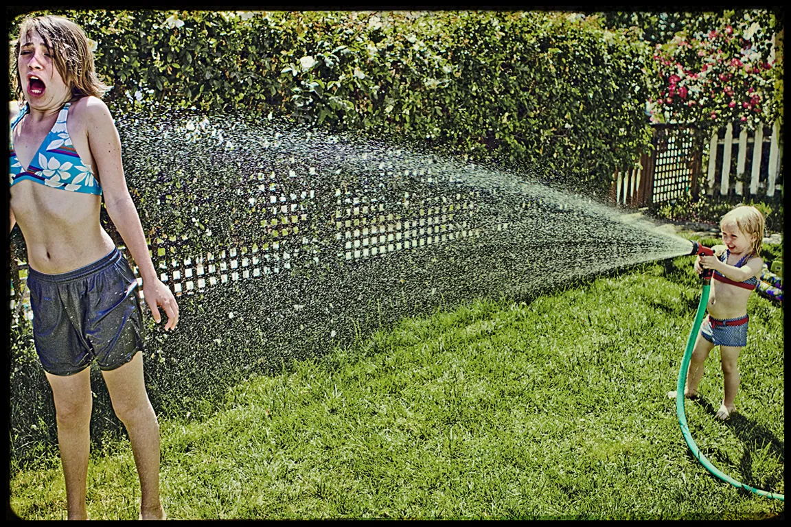 Summertime Hosedown. “Dang, it's like 90 degrees in Alameda today. Bought a kiddie pool and the girls had a water fight. This shot shows the 3 foot underdog won that fight” – Rich. (Photo by Rich)