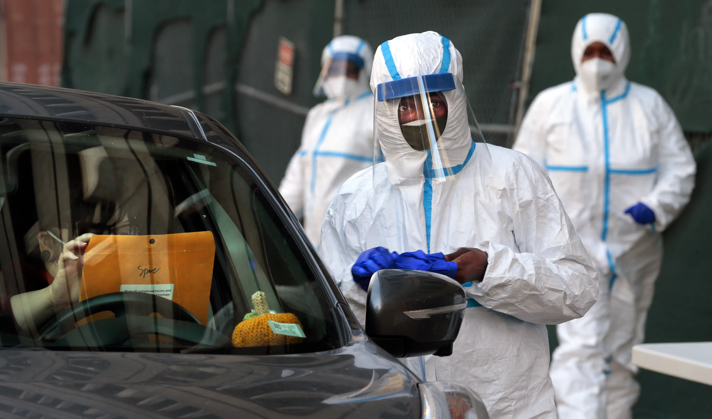 Clemintine Banks, front right, changes gloves after handing a ballot to a person who tested positive for COVID-19 during curbside voting at the St. Louis Board of Election Commissioners on Locust Street, around the corner from board offices in downtown St. Louis, Monday, November 2, 2020. (Photo by Robert Cohen/St. Louis Post-Dispatch via AP Photo)